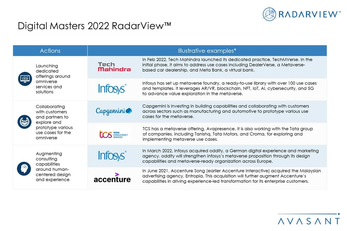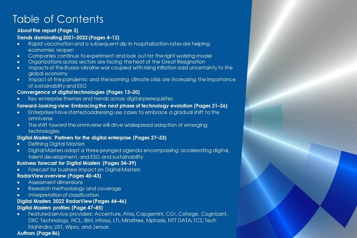 This RadarView includes a detailed analysis of the following Digital Masters: Accenture, Atos, Capgemini, CGI, Coforge, Cognizant, DXC Technology, HCL, IBM, Infosys, LTI, Mindtree, Mphasis, NTT DATA, TCS, Tech Mahindra, UST, Wipro, and Zensar.
