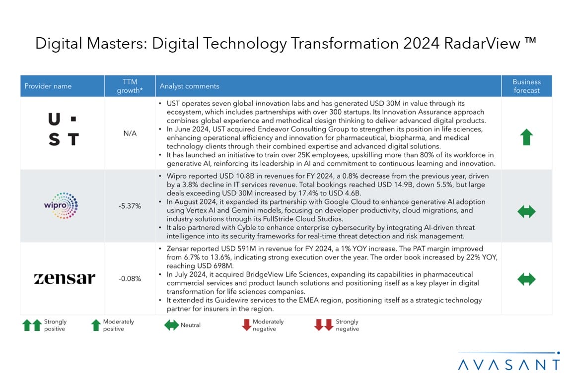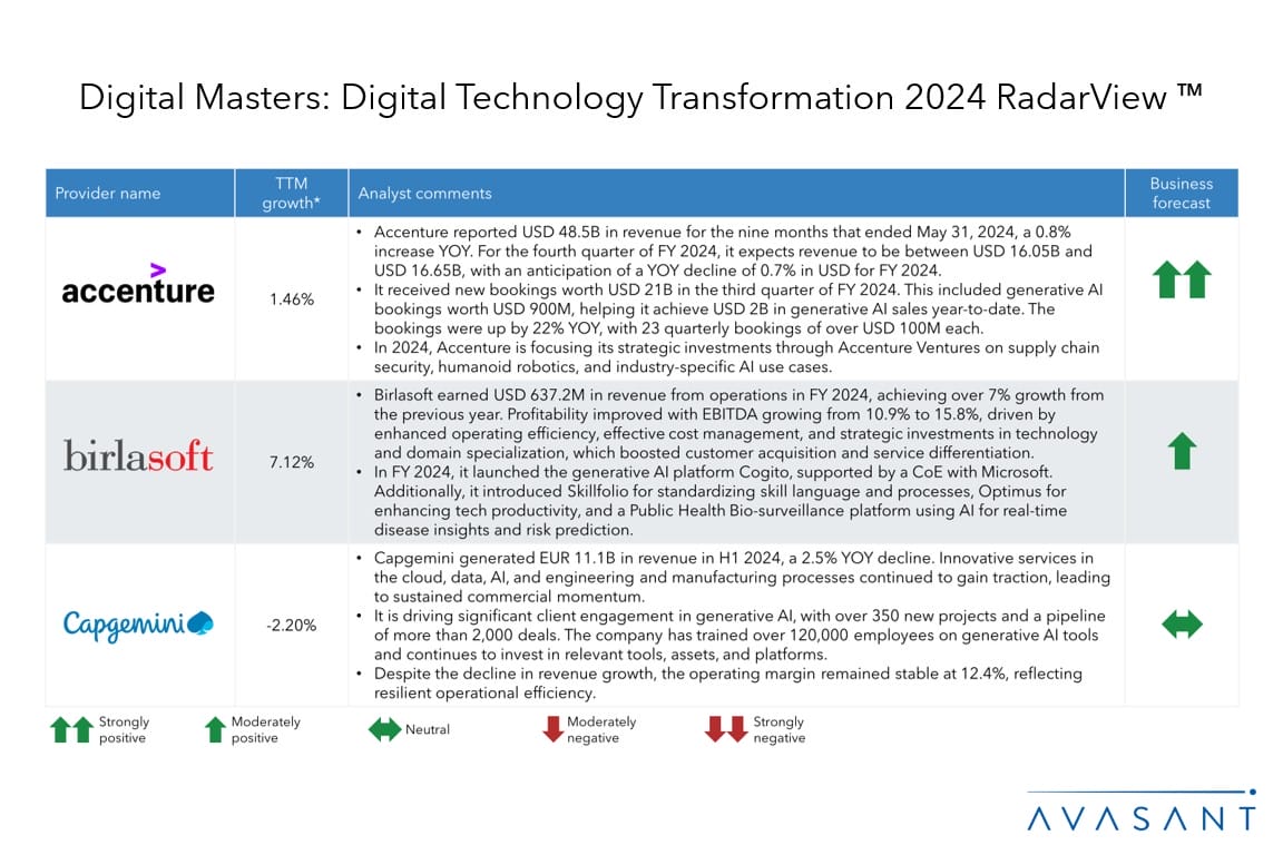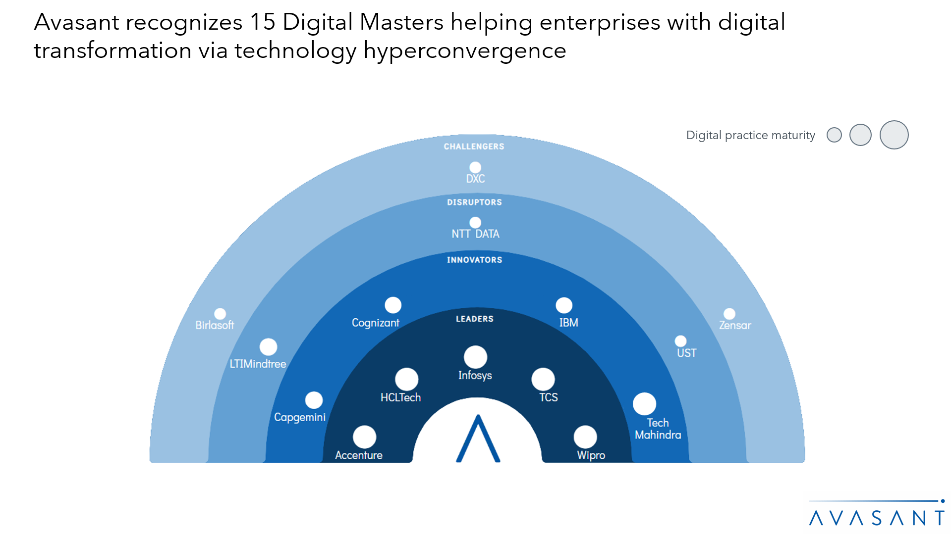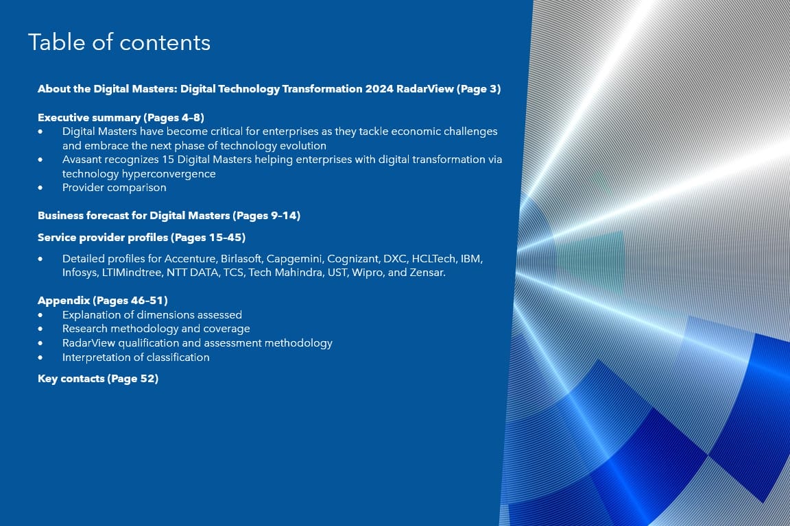 This RadarView includes a detailed analysis of the following Digital Masters: Accenture, Birlasoft, Capgemini, Cognizant, DXC, HCLTech, IBM, Infosys, LTIMindtree, NTT DATA, TCS, Tech Mahindra, UST, Wipro, and Zensar.