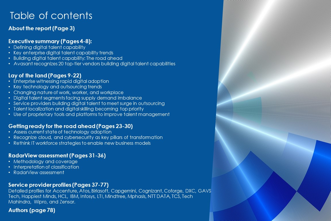 This RadarView includes an analysis of the following service providers in the digital talent capability space: Accenture, Atos, Birlasoft, Capgemini, Cognizant, Coforge, DXC, GAVS Tech, Happiest Minds, HCL, IBM, Infosys, LTI, Mindtree, Mphasis, NTT DATA, TCS, Tech Mahindra, Wipro, and Zensar.