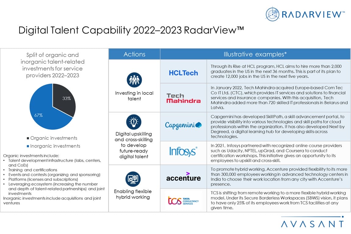 With enterprises and service providers across industries facing a talent shortage, they are investing in digital technology-related capabilities and initiatives to develop relevant skills in their workforce. To build digital talent along with enabling hybrid work, enterprises and service providers are focusing on digital reskilling by improving talent development infrastructure, talent localization, and inorganic talent acquisition.