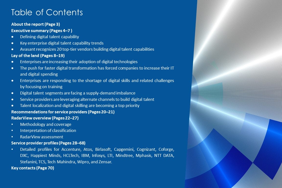 This RadarView includes an analysis of the following service providers in the digital talent capability space: Accenture, Atos, Birlasoft, Capgemini, Cognizant, Coforge, DXC, Happiest Minds, HCLTech, IBM, Infosys, LTI, Mindtree, Mphasis, NTT DATA, Stefanini, TCS, Tech Mahindra, Wipro, and Zensar.