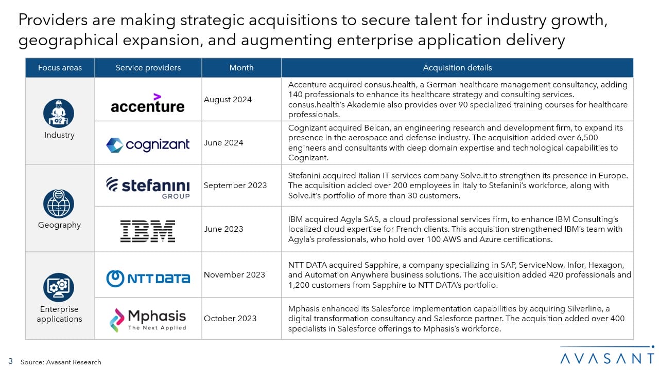 Service providers are increasingly deploying Gen AI as the next productivity lever following the advancements of RPA and traditional AI. In pursuit of new growth opportunities, many providers are expanding their delivery centers to emerging outsourcing hubs such as Saudi Arabia and Mexico, where government incentives play a pivotal role in attracting investments. Additionally, they are shifting operations to Tier II and Tier III cities in India to tap into local talent pools, reduce operational costs, and retain employees.