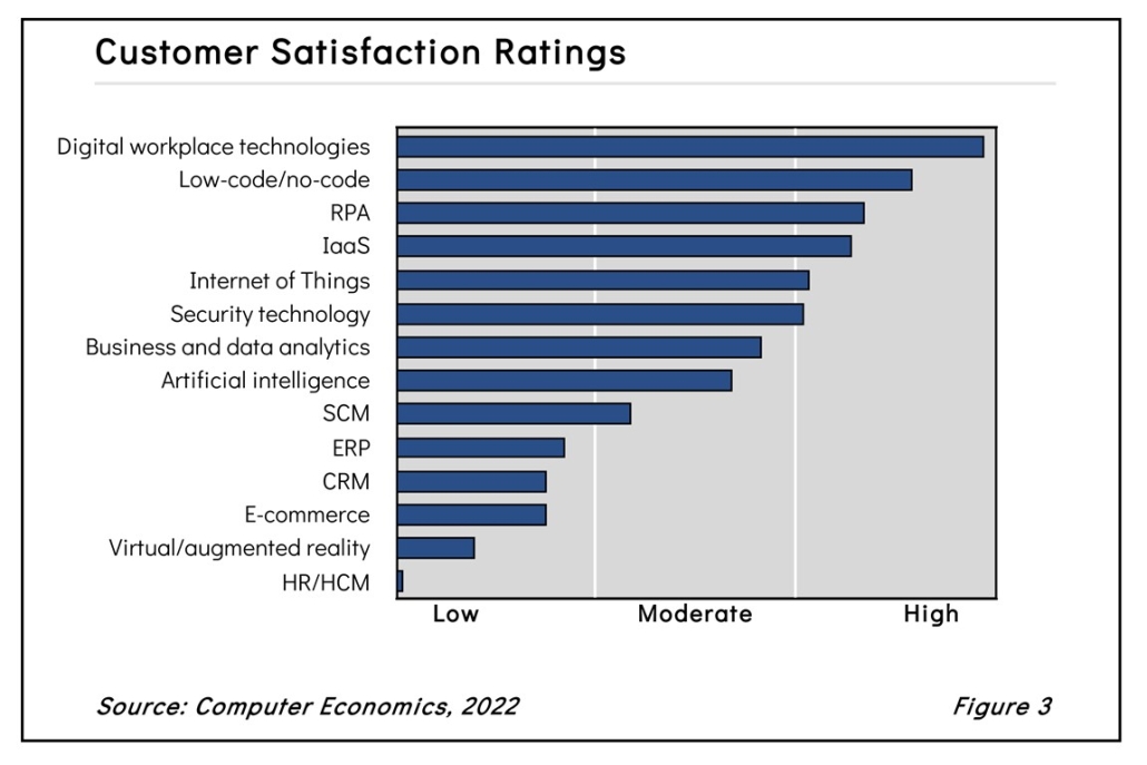 As shown in Figure 3 from our Technology Trends 2022 study, digital workplace technologies tops the satisfaction list, followed by another new entrant this year, low-code/no-code. The ratings are based on the percentage of companies saying they are satisfied or very satisfied with their experience with each of the 14 technologies in our survey. The satisfaction ratings are based on a relative scale determined by the highest and lowest values for all technologies in the study.