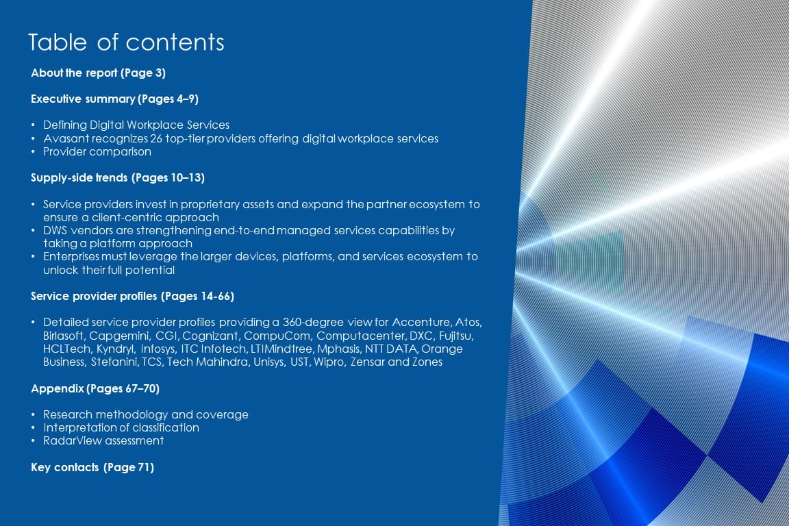 This RadarView helps enterprises identify key service providers to implement and manage a digital workplace. It begins with a summary of key trends shaping the market and Avasant’s viewpoint on digital workplace services over the next 12 to 18 months.