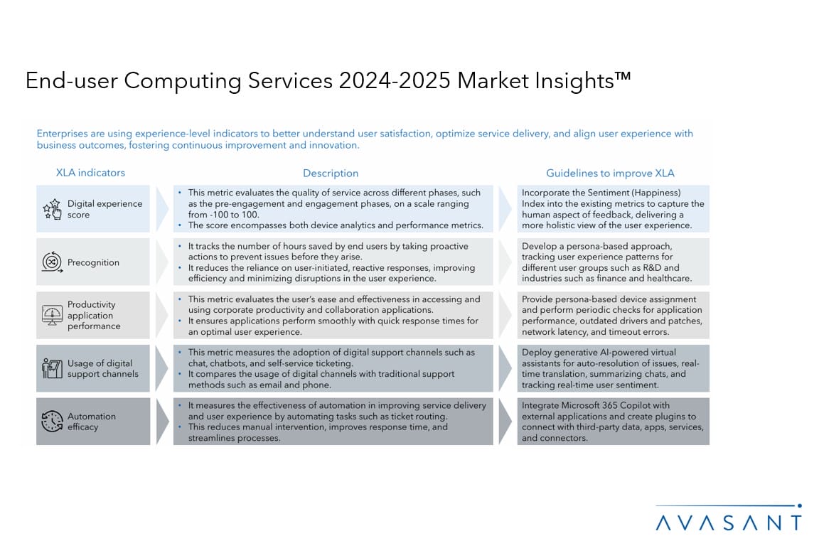 Enterprises focus on improving user experience and productivity by leveraging emerging technologies such as AI and analytics across various applications. They use generative AI to enhance communication, boost productivity with AI-powered PCs, strengthen endpoint security, and deploy chatbots for efficient support. They are moving away from the service-level agreement (SLA)-based pricing model to the experience-level agreement (XLA)-based pricing model, which focuses on user experience and outcomes rather than solely on technical performance.
