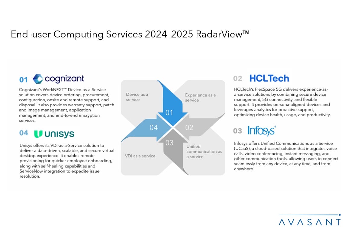 The End-user Computing Services 2024–2025 RadarView™ highlights key supply-side trends in the end-user computing space and Avasant’s viewpoint on them. It aids companies in identifying top service providers to assist them in adopting end-user computing services. It also analyzes each service provider’s technology and delivery support capabilities, enabling organizations to identify the right strategic partners for managing their end-user computing environment.