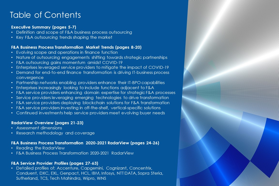 This RadarView includes a detailed analysis of the following finance and accounting service providers: Accenture, Capgemini, Cognizant, Concentrix, Conduent, DXC, EXL, Genpact, HCL, IBM, Infosys, NTT DATA, Sopra Steria, Sutherland, TCS, Tech Mahindra, Wipro, WNS.