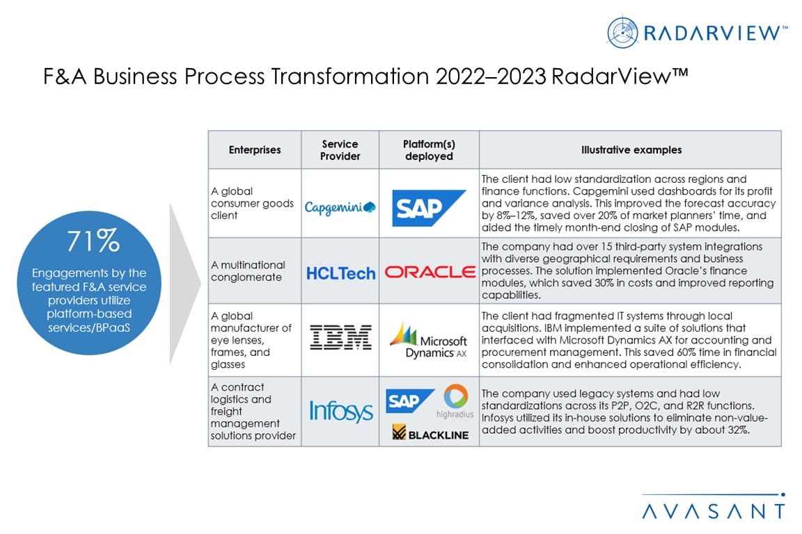 Each profile provides an overview of the service provider, its intellectual property assets for F&A, and a list of clients and partnerships, along with brief client case studies. Each profile concludes with analyst insights on the service provider’s practice maturity, domain ecosystem, and investments and innovation.