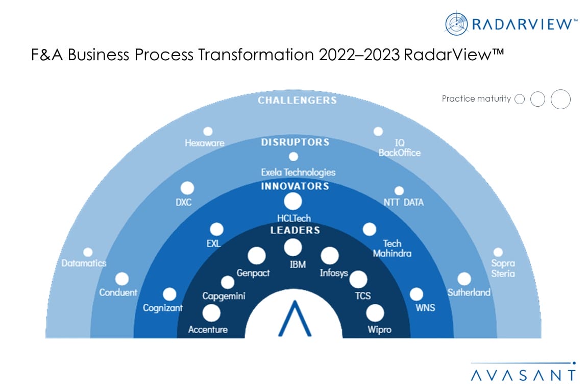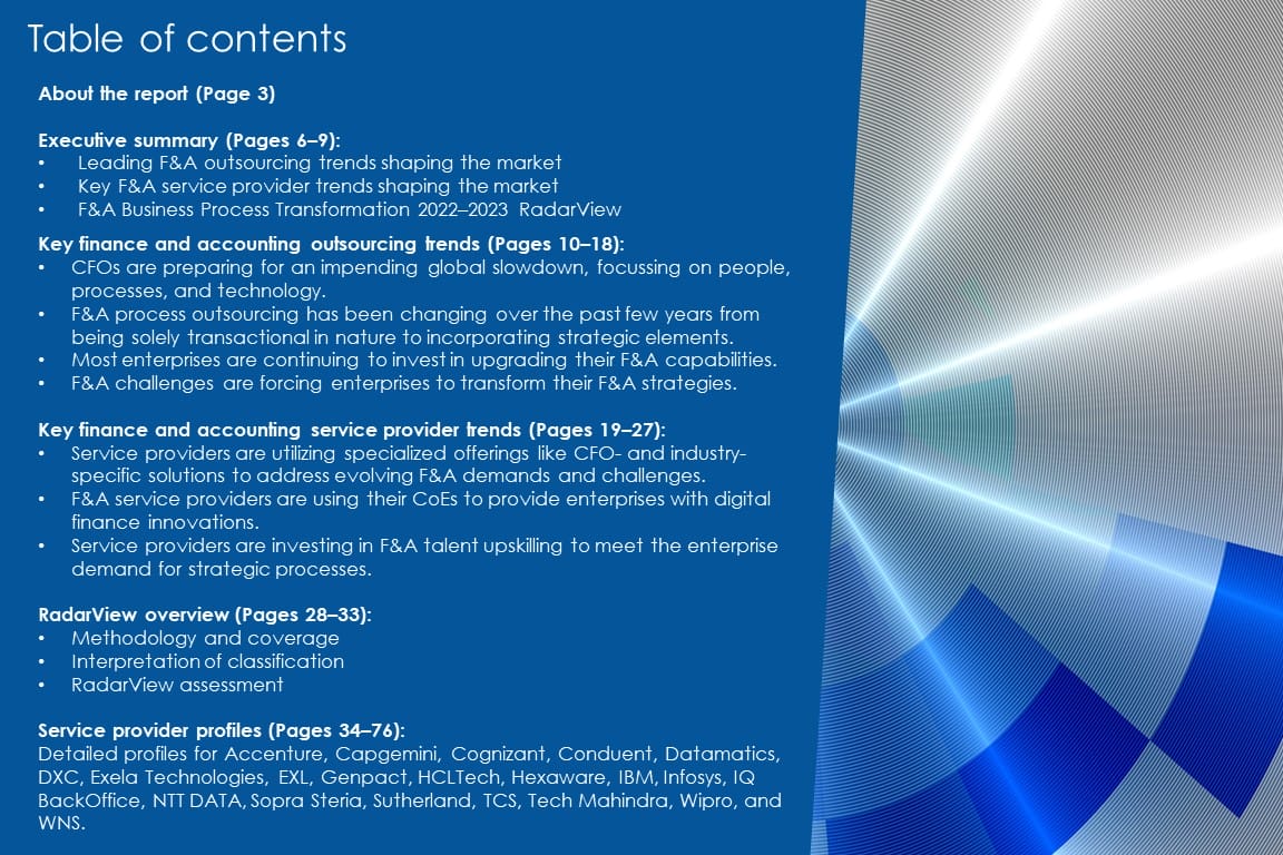 This RadarView includes a detailed analysis of the following F&A service providers: Accenture, Capgemini, Cognizant, Conduent, Datamatics, DXC, Exela Technologies, EXL, Genpact, HCLTech, Hexaware, IBM, Infosys, IQ BackOffice, NTT DATA, Sopra Steria, Sutherland, TCS, Tech Mahindra, Wipro, and WNS.