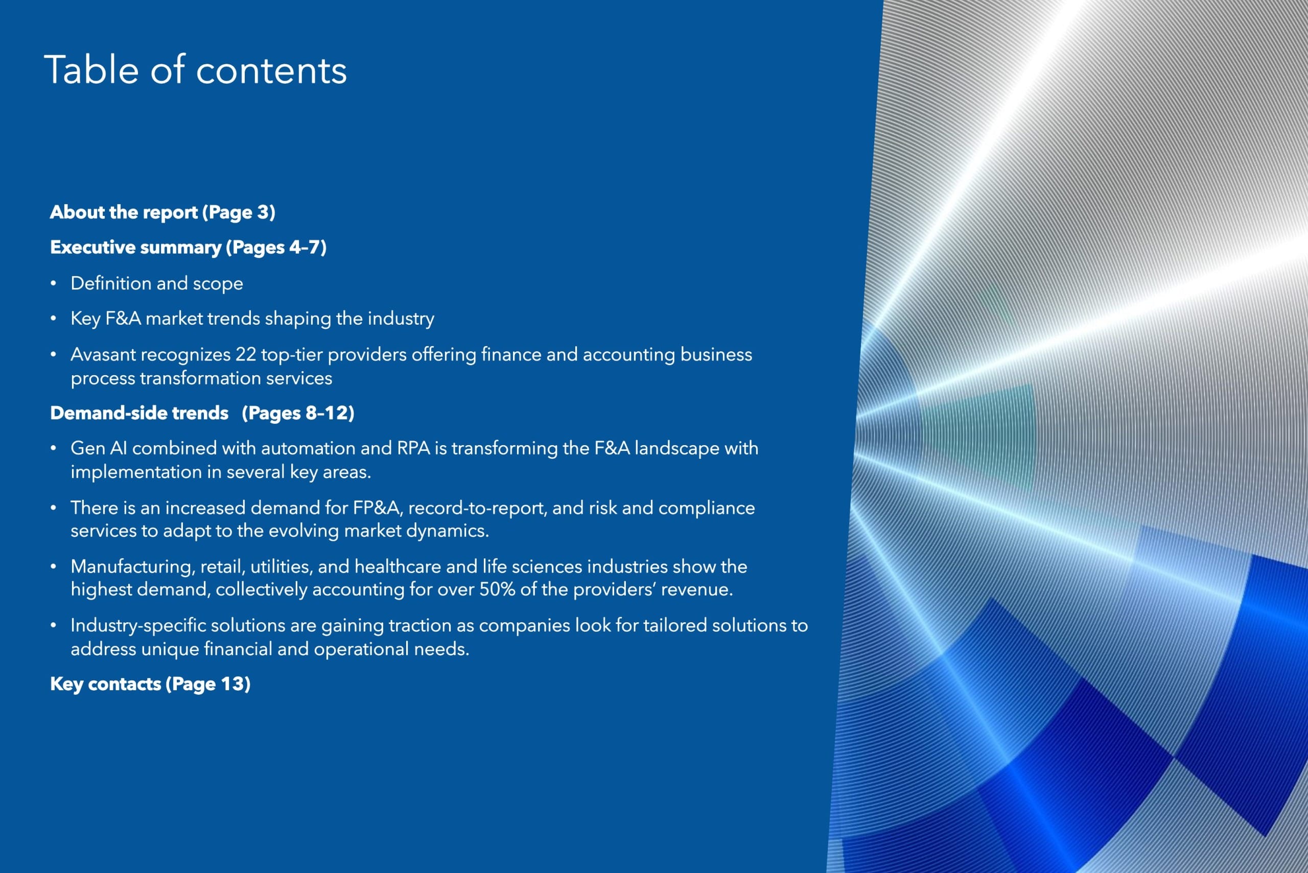 This report identifies key demand-side trends in the F&A business process transformation space to help enterprises fine-tune their operations. It provides an overview of key observations and business challenges that Avasant considers important to highlight in the F&A outsourcing space.