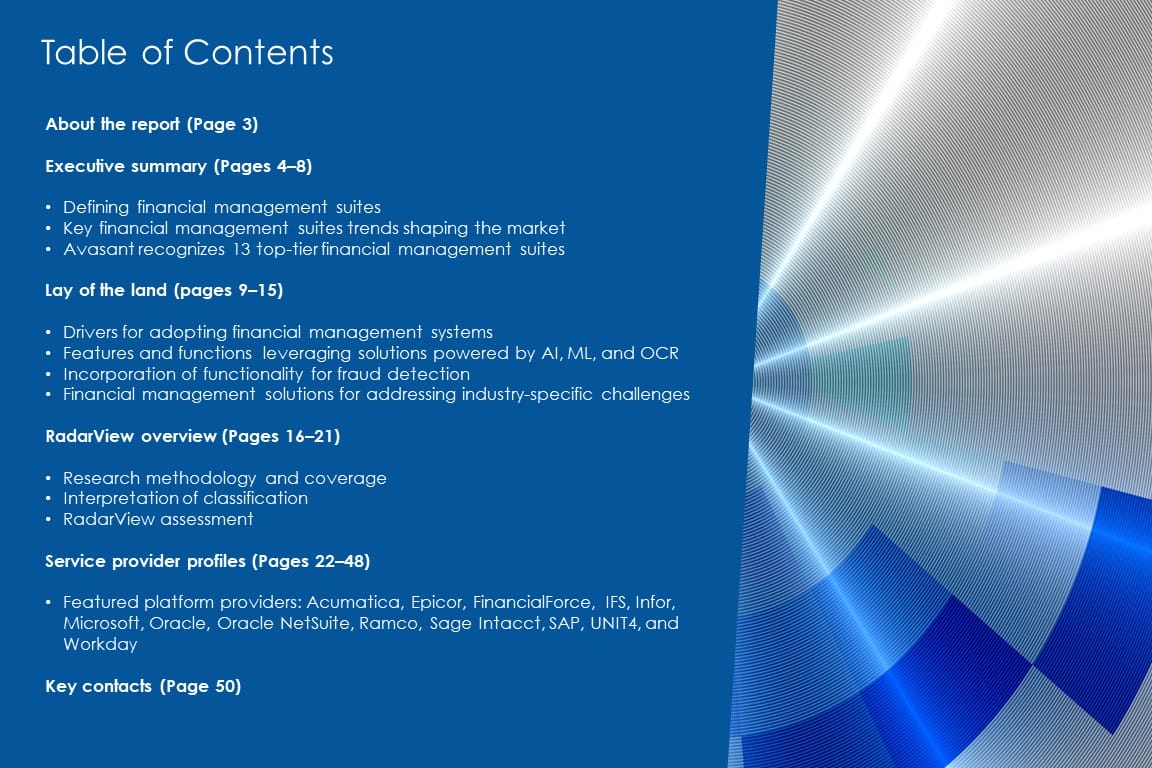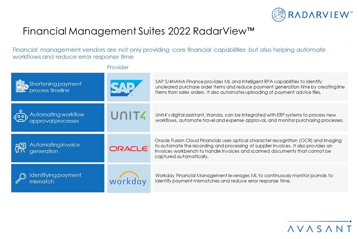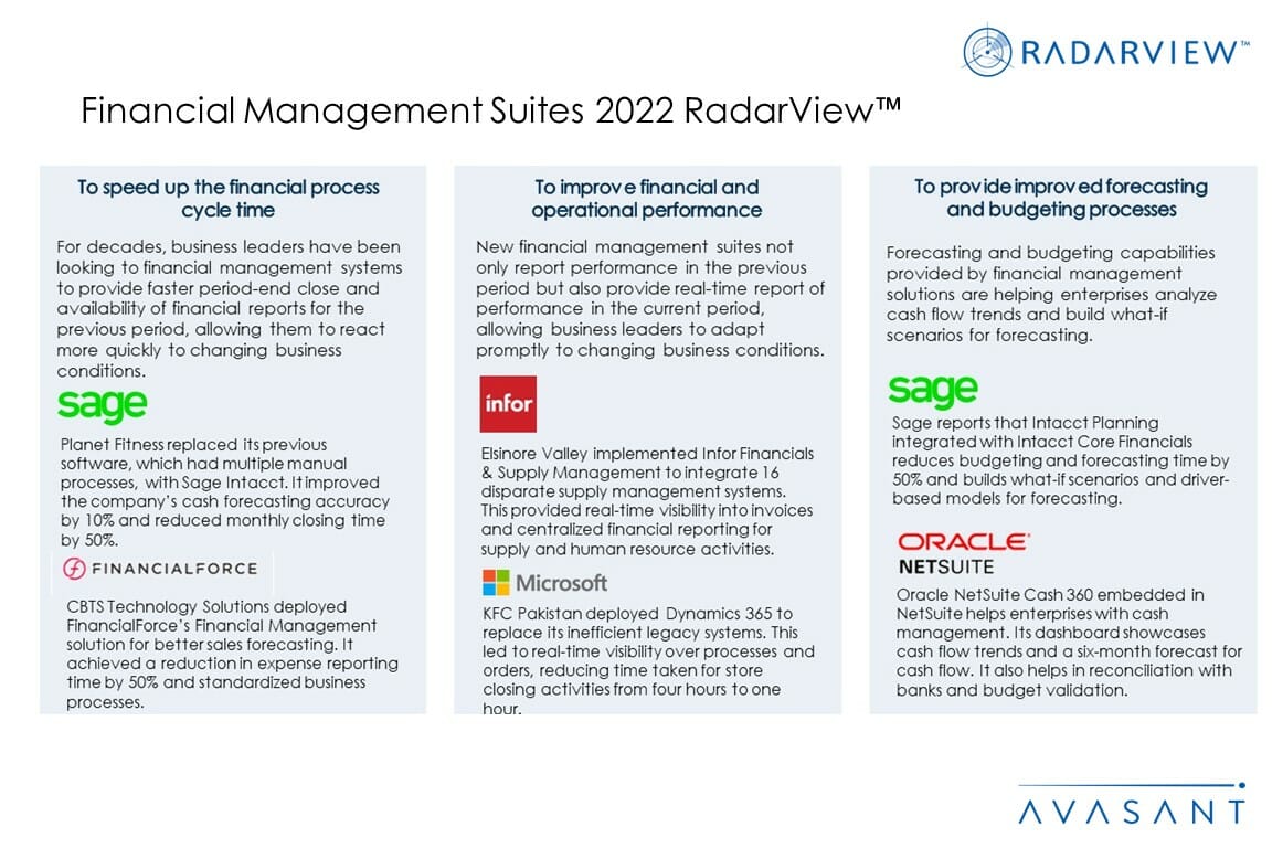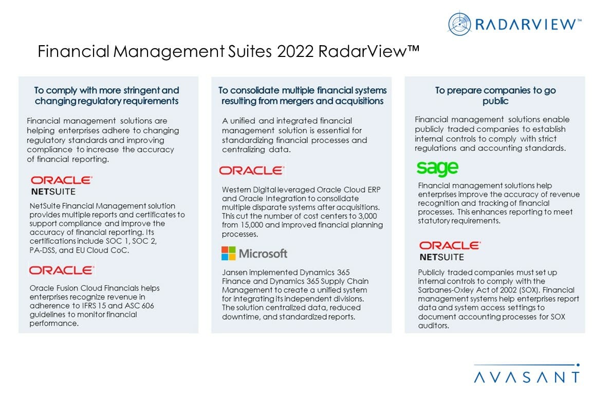 This RadarView includes an analysis of the following Financial Management Suites vendors: Acumatica, Epicor, FinancialForce, IFS, Infor, Microsoft, Oracle, Oracle NetSuite, Ramco, Sage Intacct, SAP, UNIT4, and Workday.