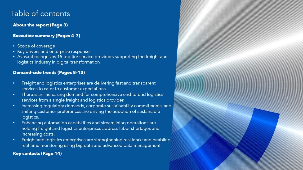 This report identifies key demand-side trends in the freight and logistics industry that can help enterprises fine-tune their digital strategies. It also provides an overview of enterprise challenges in this space based on Avasant’s assessment.