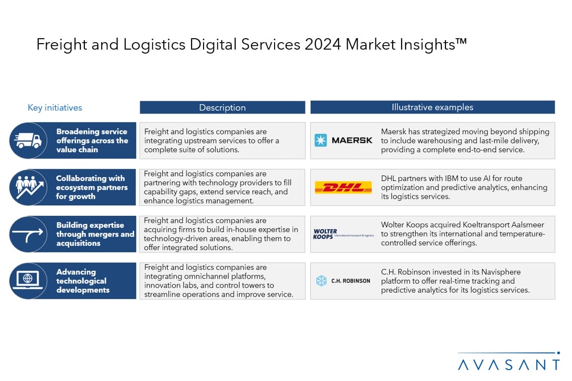 Freight and logistics companies are leveraging digital platforms, automation, and demand forecasting to enhance operational efficiency, real-time visibility, and last-mile delivery optimization. They are broadening service offerings, collaborating with partners, and acquiring companies to strengthen their capabilities, including managing digital freight marketplaces and adopting eco-friendly technologies. Additionally, they are using blockchain for secure tracking, automation for improved productivity, and big data for resilient supply chains while strategically planning to reduce environmental impact and operational costs. Freight and logistics enterprises collaborate with service providers for digital transformation, which requires strong technological expertise and delivery capabilities.