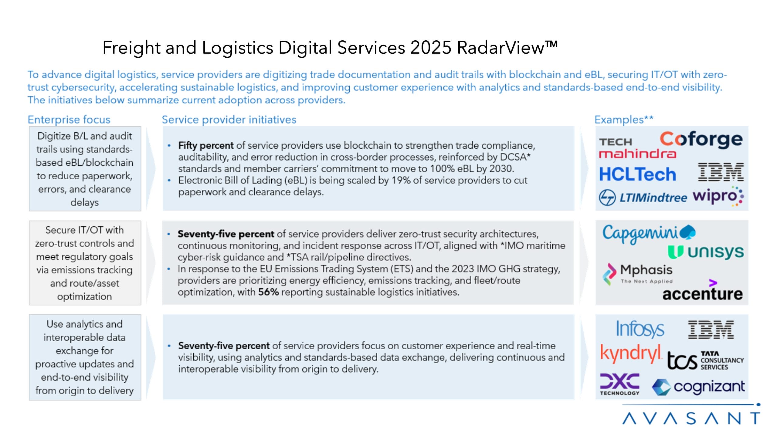 The Freight and Logistics Digital Services 2025 RadarView™ highlights key supply-side trends in the freight and logistics industry and Avasant’s viewpoint on them. It aids companies in identifying top service providers to assist them in the digital transformation of their offerings for this sector. It also analyzes each service provider’s capabilities in technology and delivery support, enabling organizations to identify the right strategic partners.