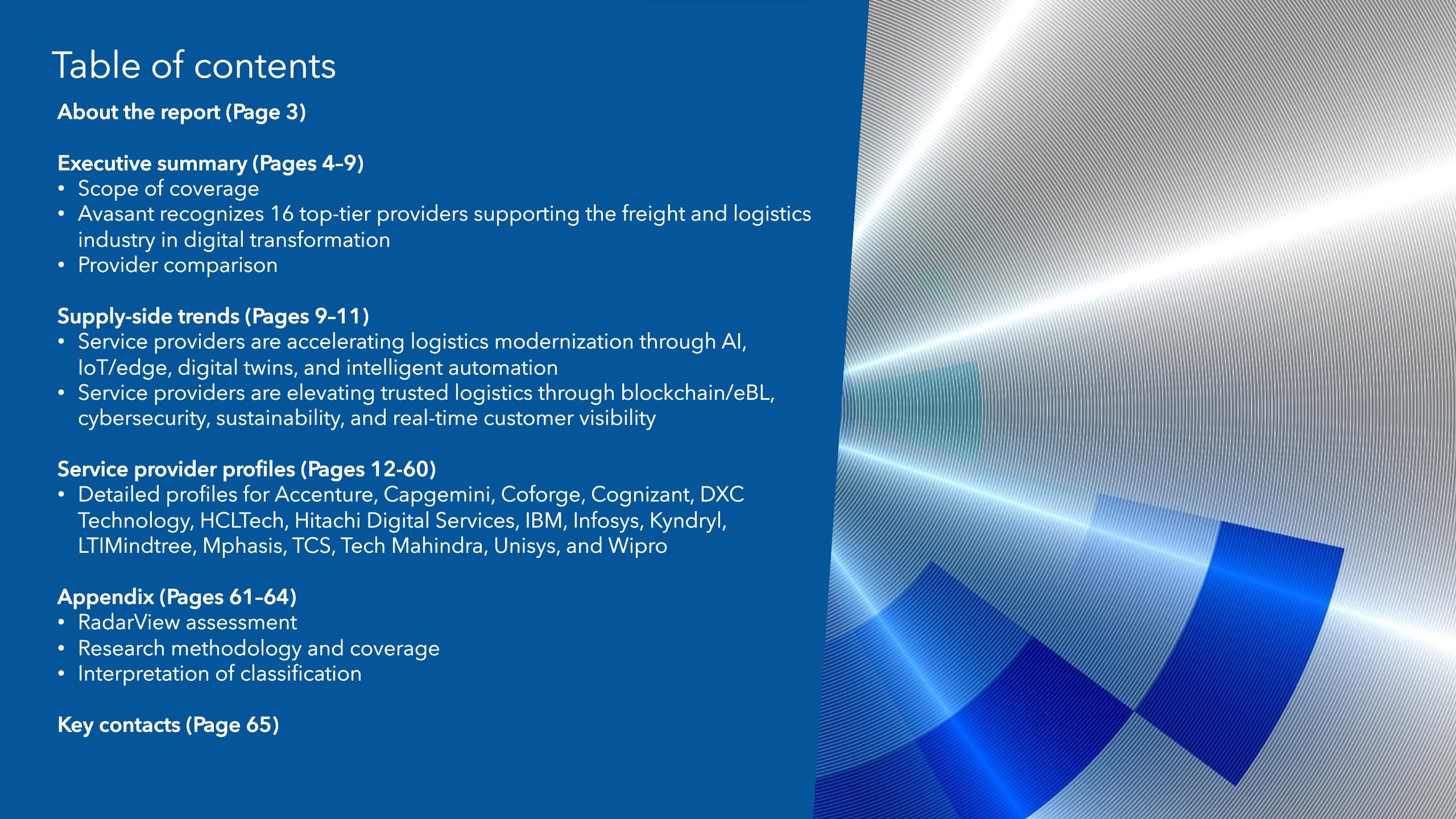 This RadarView aims to help freight and logistics enterprises craft a robust strategy based on industry outlook, best practices, and digital transformation. It begins with a summary of key trends shaping the supply side of the market. It continues with a detailed assessment of 16 providers offering digital services in the freight and logistics industry. Each profile provides an overview of the service provider, its industry-specific solutions, a list of representative clients and partnerships, and brief client case studies. Each profile concludes with analyst insights on the provider’s practice maturity, investments and innovation, and partner ecosystem.