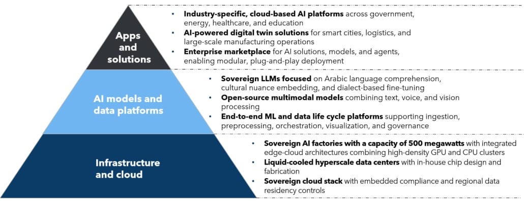 Talent also forms a critical pillar of the HUMAIN initiative. Saudi Arabia is consolidating top talent from top digital companies, including Saudi Data and AI Authority (SDAIA), TONOMUS, and Aramco Digital, under the HUMAIN umbrella. Strategic partnerships with global tech firms further strengthen the initiative, enabling it to scale generative AI (Gen AI) skills and workforce readiness in alignment with Vision 2030’s digital transformation agenda.