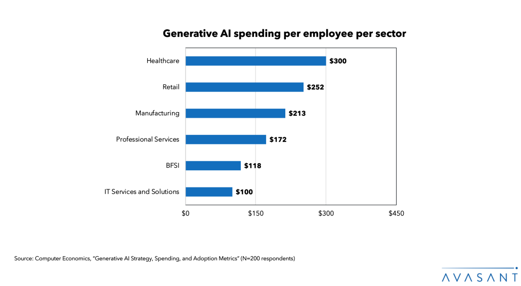 Governments, research institutions, and healthcare organizations are allocating investments to accelerate AI-driven breakthroughs in the healthcare sector, addressing some of the industry’s most pressing challenges. Our Generative AI Strategy, Spending, and Adoption Metrics report highlighted that the healthcare sector leads the generative AI spending. Figure 1 shows that the healthcare sector tops the generative AI spending, with a $300 median spend per employee. This spending underscores a growing commitment to leveraging generative AI for transformative healthcare solutions, paving the way for a resilient global healthcare ecosystem.