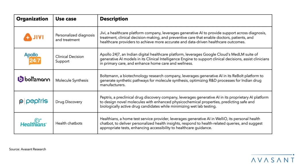 The practical applications of generative AI in India’s HLS sector extend beyond theoretical possibilities. From diagnostics to drug discovery and patient engagement, organizations are leveraging generative AI to enhance efficiency, reduce costs, and improve accessibility. Figure 2 highlights a few examples of generative AI-driven advancements by Indian healthcare organizations.