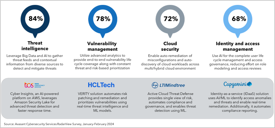 The Avasant Cybersecurity Services 2024 RadarView survey, conducted in January–February 2024, confirms this trend, with leading MSSPs focusing on proprietary platforms and advancing their AI capabilities to deliver greater value. The survey revealed that 84% of providers are focusing on enhancing threat intelligence, followed by investments in vulnerability management, cloud security, and identity and access management. Figure 1 below illustrates these trends, showcasing initiatives from select MSSPs.