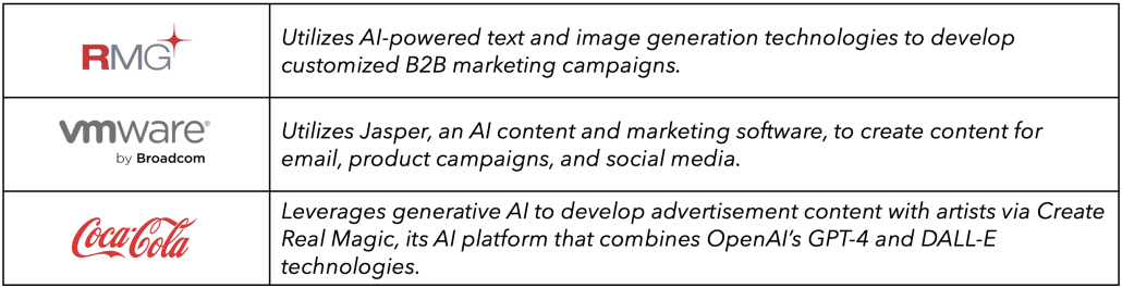 An example is Spotify, which uses generative AI (OpenAI) to analyze user listening patterns and preferences to let music editors provide listeners with insightful facts about the music, artists, and genres and create personalized playlists based on listening habits. The company is further exploring creating podcast summaries and audio ads by leveraging generative AI.