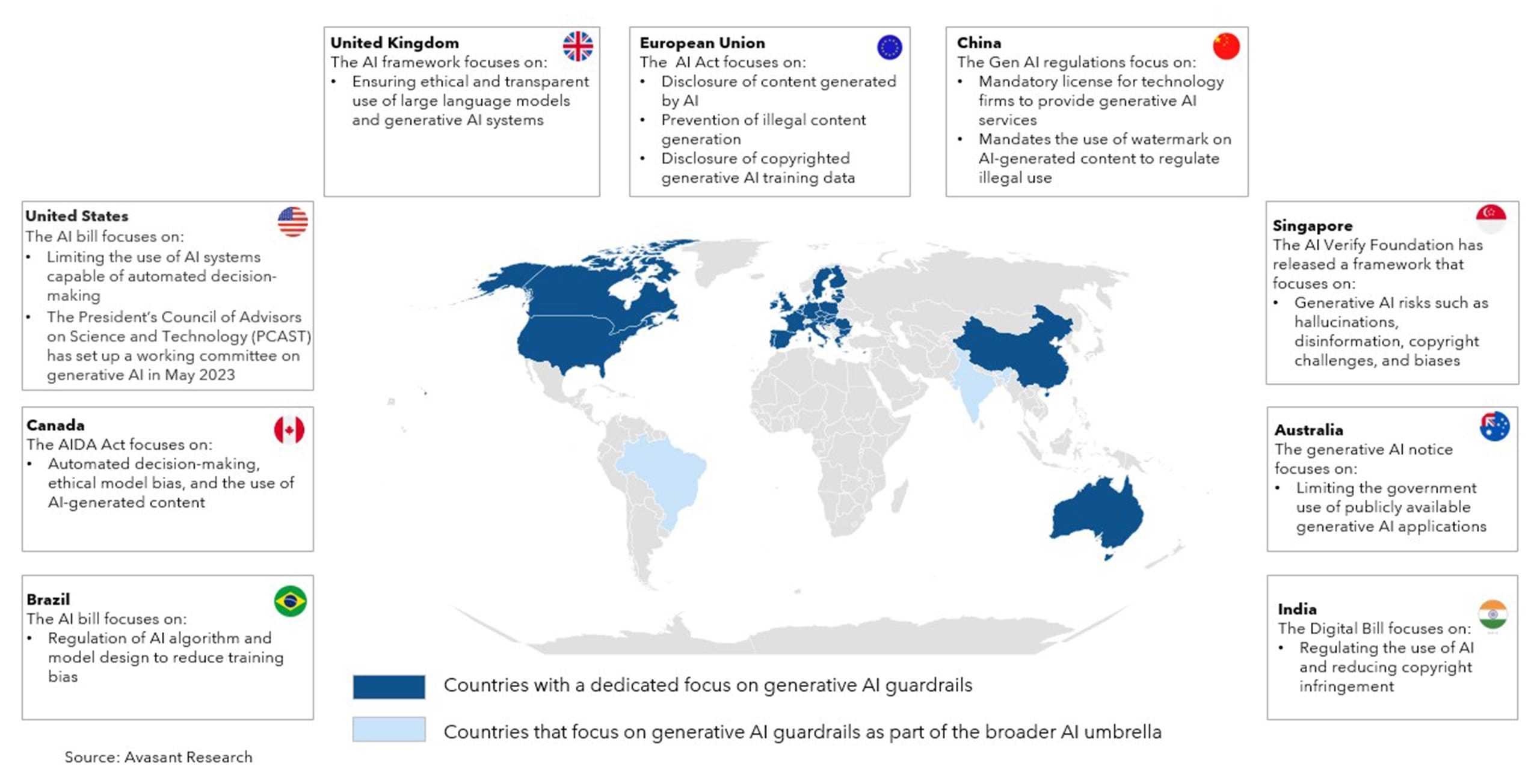 Many countries, including the United States and China, and the countries under the European Union, have introduced bills and regulations monitoring generative AI usage. These address copyrighted content generation and transfer, AI content watermarking, and automated decision-making backed by ethical AI.