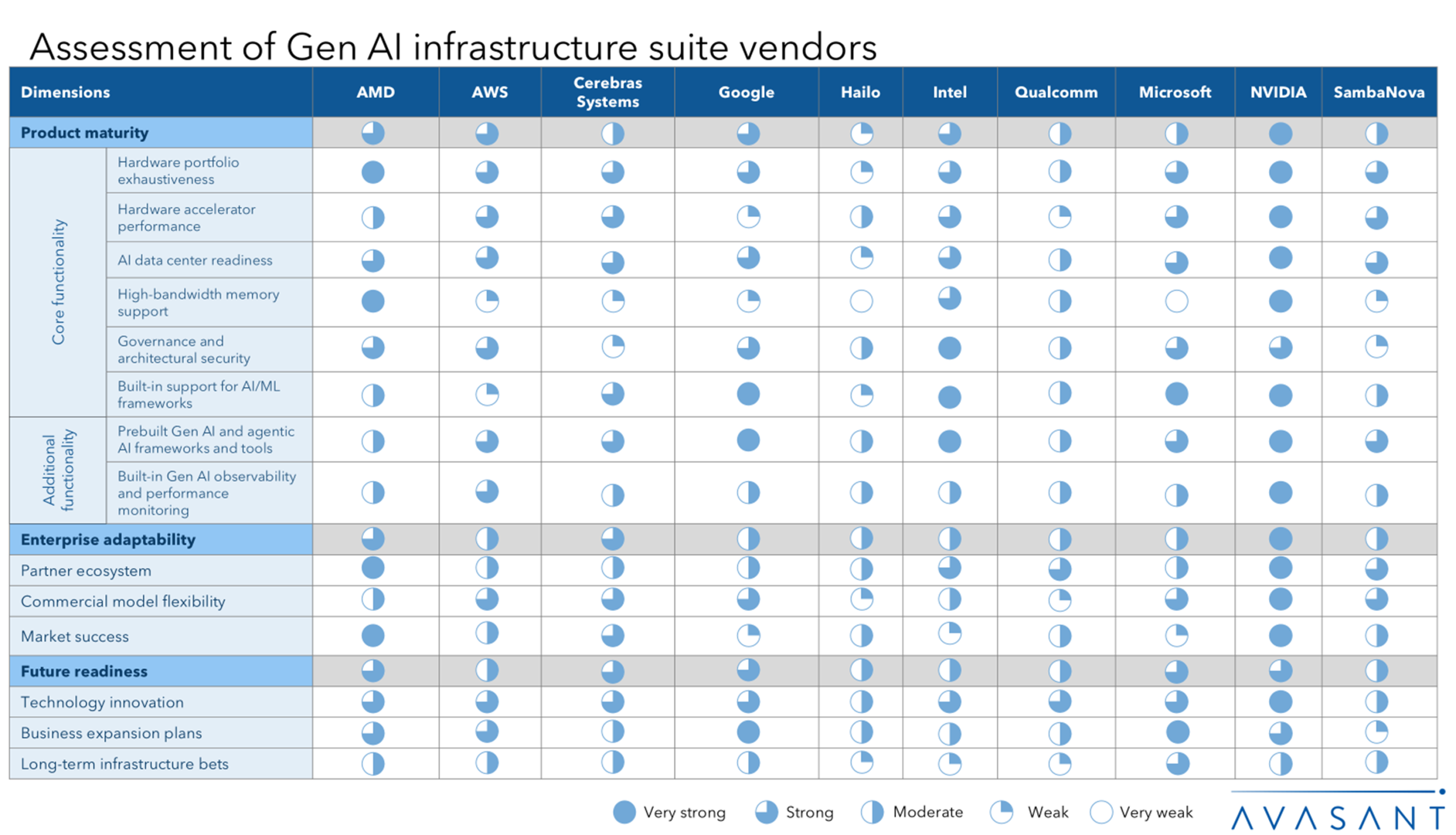 Our evaluation of vendors is based on public disclosures, case studies, product sheets, executive interviews, and our ongoing market interactions. We assess the providers’ Gen AI infrastructure implementation capabilities across enterprises, leading to our recognition of the vendors that have brought the most value to the market.