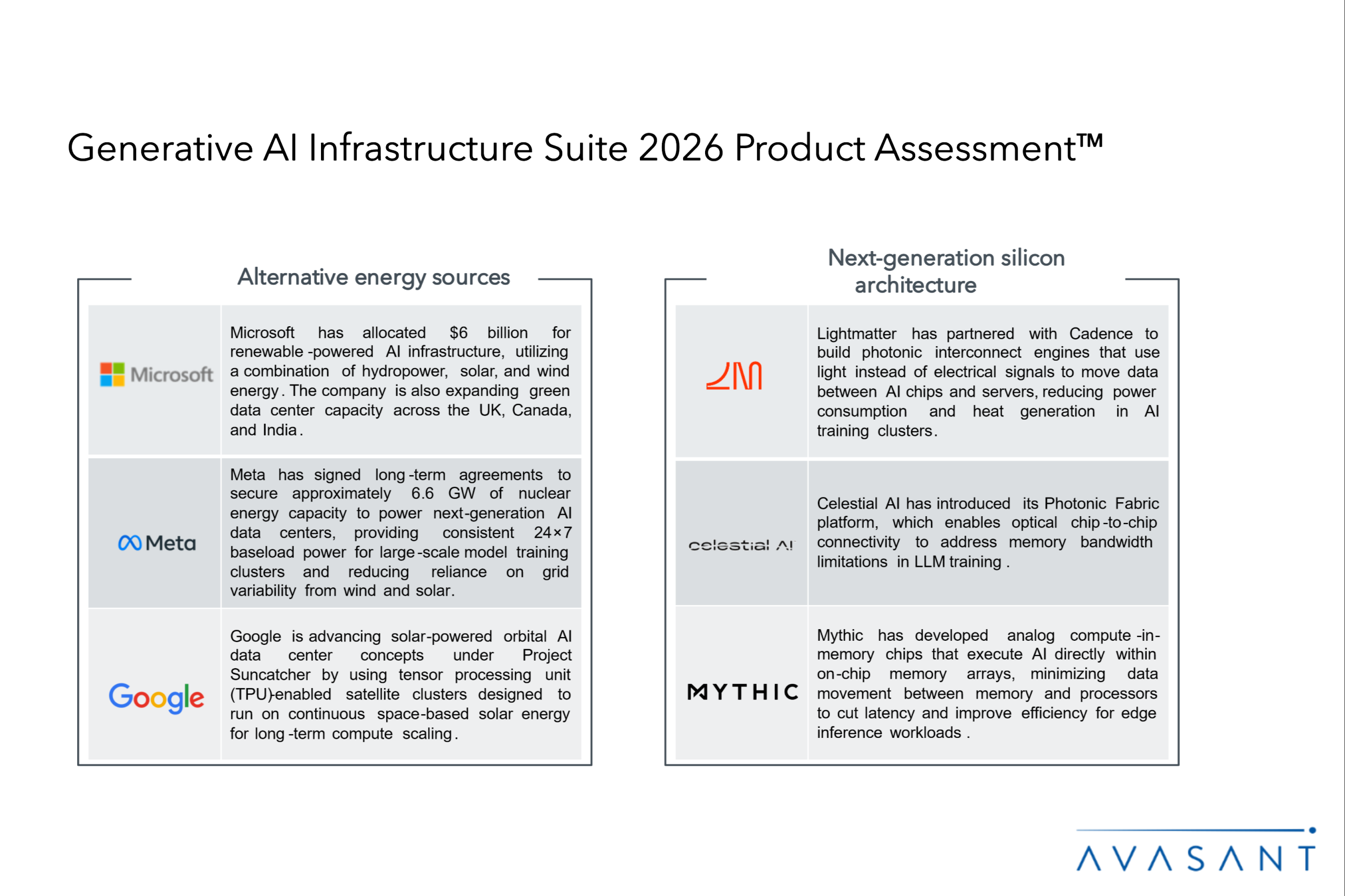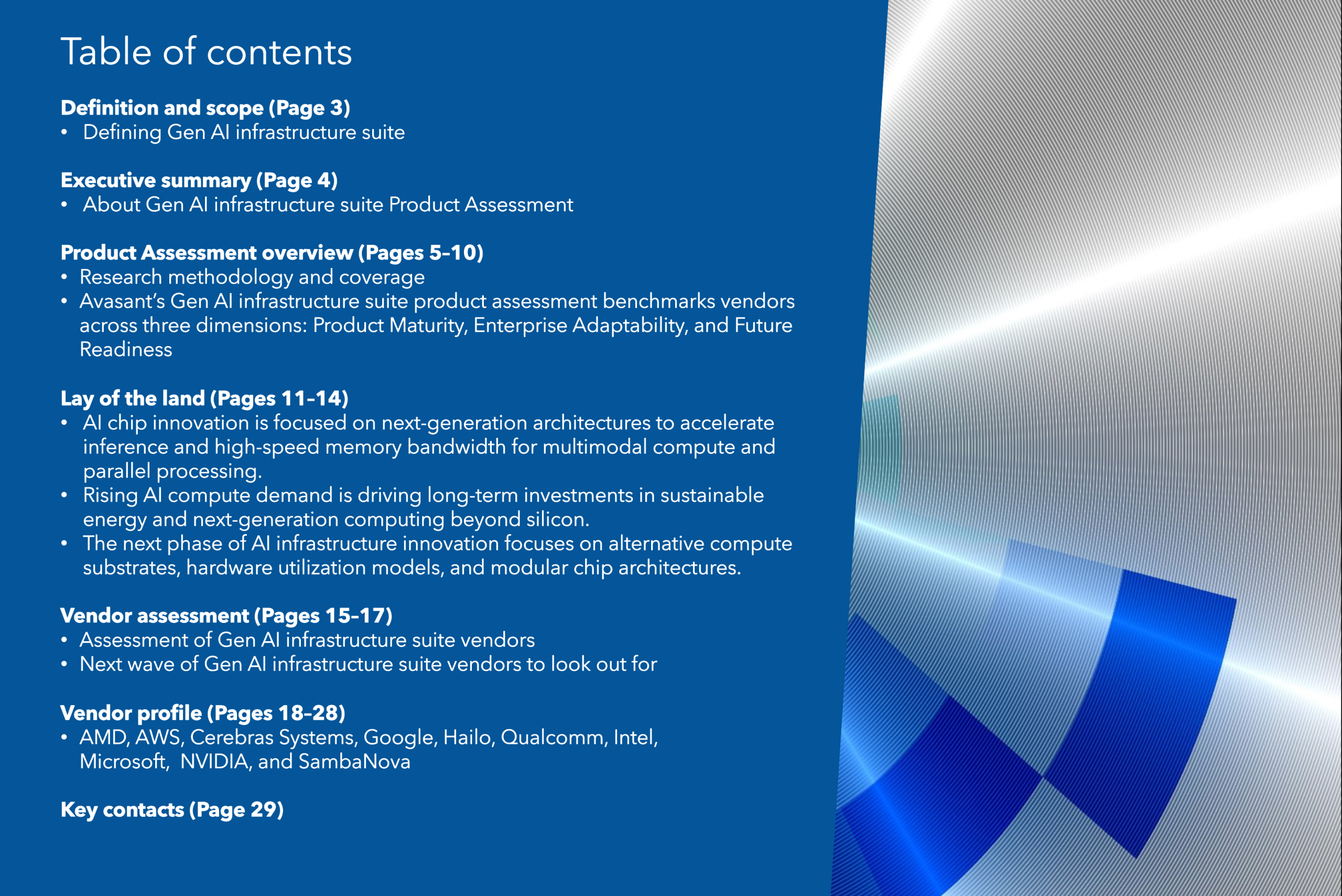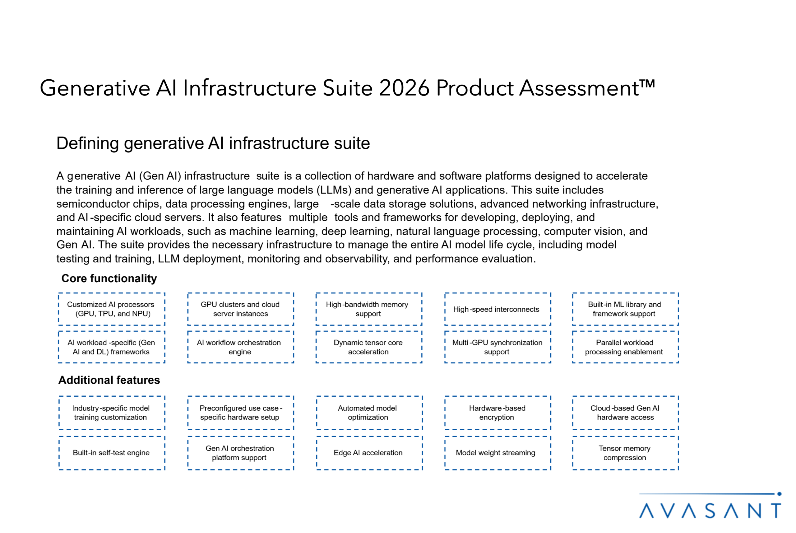 This Product Assessment provides key information on select vendors offering comprehensive generative AI (Gen AI) infrastructure suites. The report begins with the definition and scope of the Gen AI infrastructure suite, followed by leading vendors in this space. It highlights the capabilities of 10 such vendors offering Gen AI infrastructure to enterprises.
