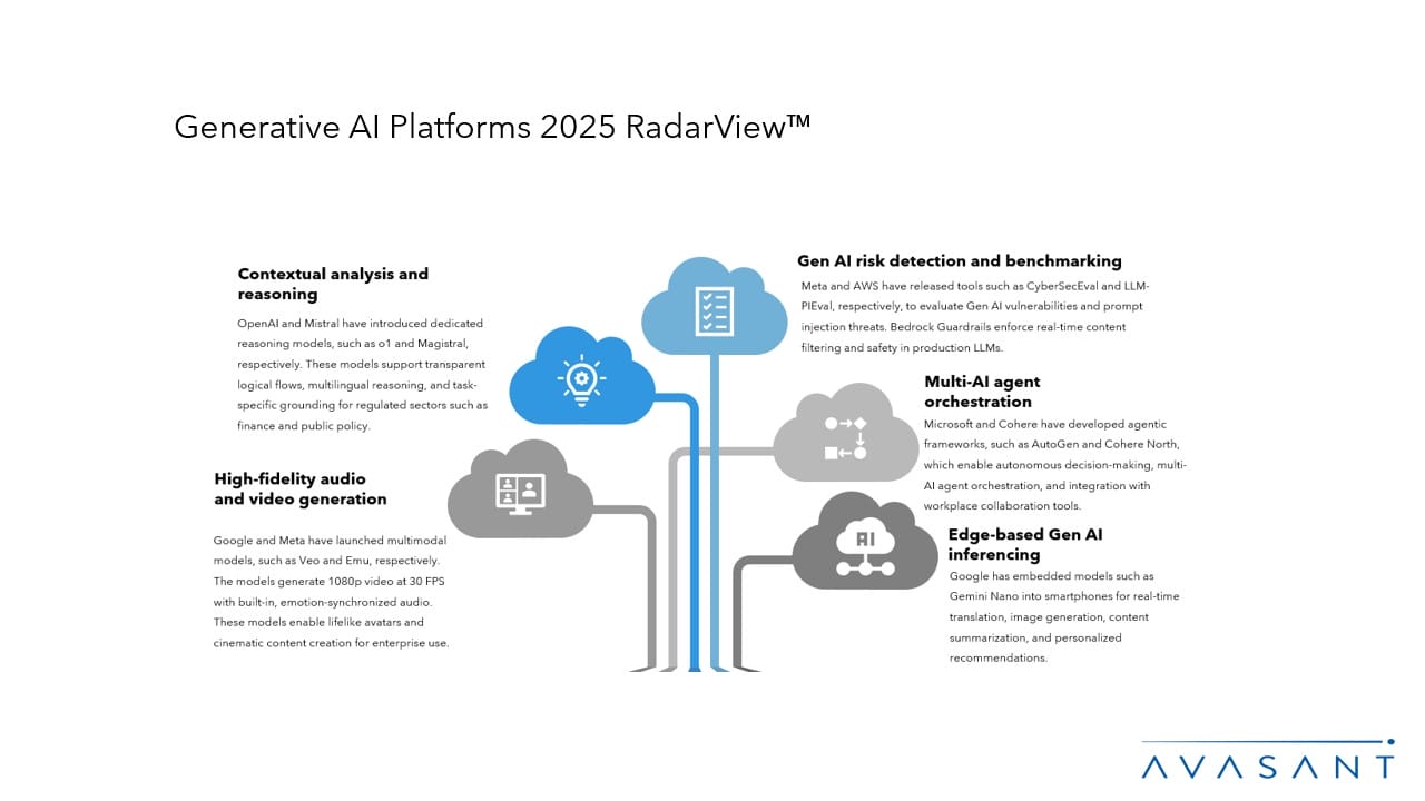 The Generative AI Platforms 2025 RadarView™ highlights key supply-side trends in this space and Avasant’s viewpoint on them. It aids companies in identifying top platform vendors who can assist them in implementing advanced Gen AI capabilities. Additionally, it provides an evaluation of each platform vendor’s technology and support services, helping organizations select the appropriate strategic partners for Gen AI management.