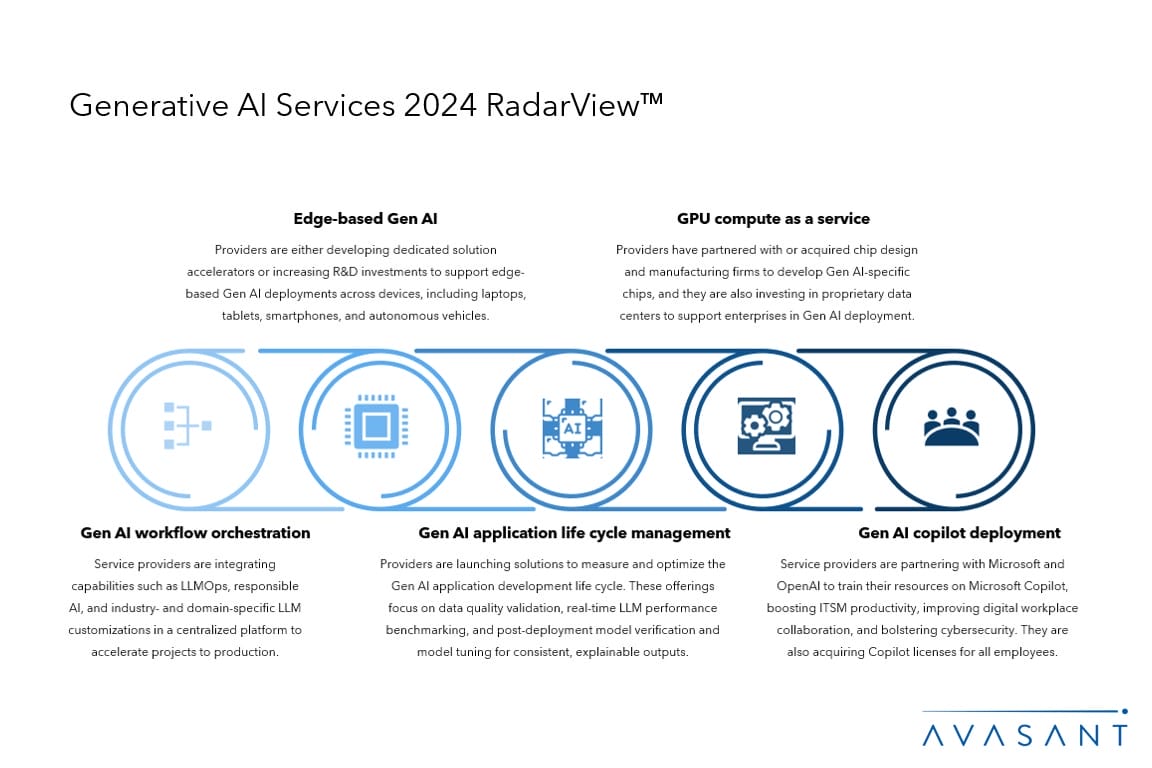 The Generative AI Services 2024 RadarView™ highlights key supply-side trends in this space and Avasant’s viewpoint on them. It aids companies in identifying top service providers to assist them in their Gen AI journeys. It also analyzes each service provider’s capabilities in technology and delivery support, enabling organizations to select the right strategic partners to implement AI.