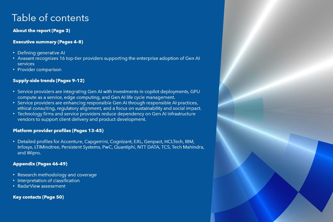 This RadarView includes a detailed analysis of the following Gen AI service providers: Accenture, Capgemini, Cognizant, EXL, Genpact, HCLTech, IBM, Infosys, LTIMindtree, Persistent Systems, PwC, Quantiphi, NTT DATA, TCS, Tech Mahindra, and Wipro.