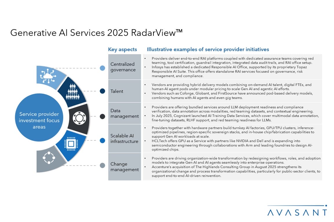 The Generative AI Services 2025 RadarView™ highlights key supply-side trends in the Gen AI space and Avasant’s viewpoint on them. It aids companies in identifying top service providers to assist them in their Gen AI adoption journey. It also analyzes each service provider’s capabilities in technology and delivery support, enabling organizations to identify the right strategic partners for Gen AI adoption.