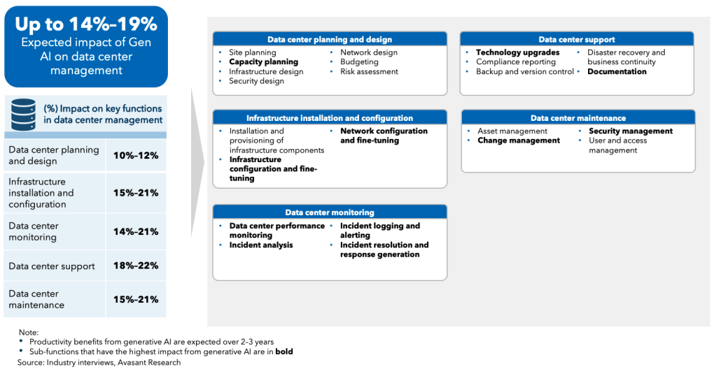 The crucial role of Gen AI across the five key data center functions is examined below.