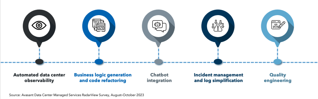 Enterprises leverage Gen AI to streamline data center operations, automate observability, and conduct faster analysis, revealing deeper patterns and insights. Gen AI is also utilized for code generation, refactoring, and logic generation from business requirements, reducing the need for manual coding and enhancing productivity. Integrating the technology into data center infrastructure support services enables the creation of AI-powered chatbots for personalized interactions and faster resolutions. Additionally, companies use Gen AI to manage incidents, automatically extracting key details, identifying the incident’s impact on the data center, and generating simplified logs. It is also instrumental in fine-tuning and optimizing the quality engineering aspects of data center-managed services by automatically generating and running diagnostic test cases.
