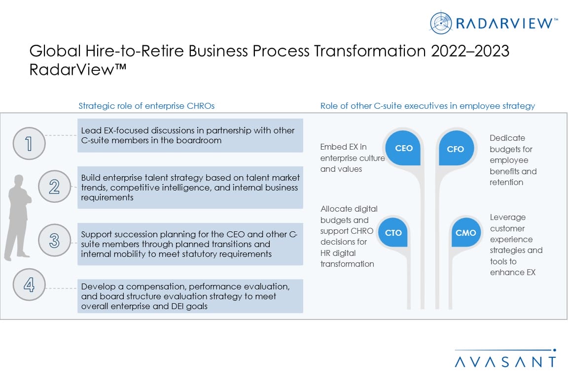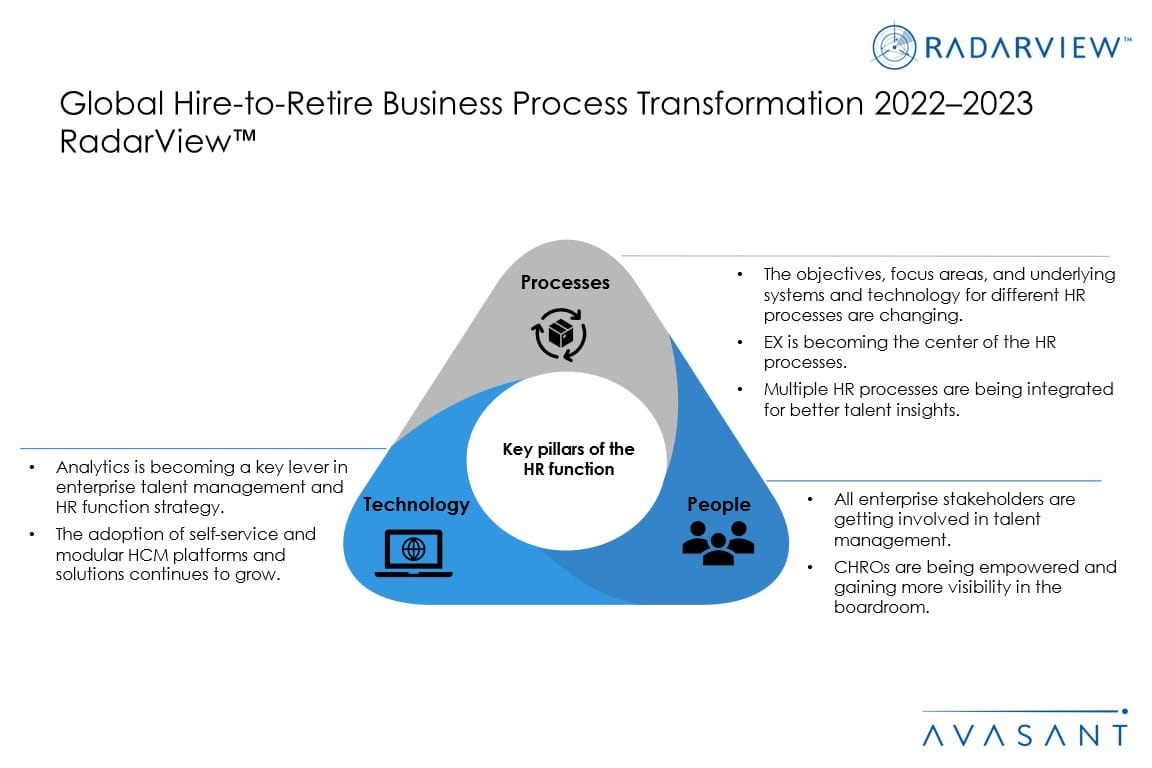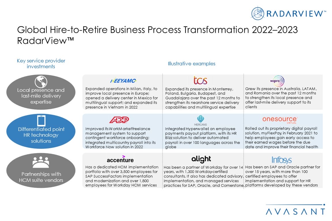 The Global Hire-to-Retire Business Process Transformation 2022–2023 RadarView™ highlights key enterprise and service provider trends in the hire-to-retire business process transformation space and Avasant’s viewpoint on them. It aids companies in identifying the top service providers and also offers an analysis of each service provider’s technical and delivery capabilities, enabling organizations to identify the right strategic partner for their HR business process transformation.