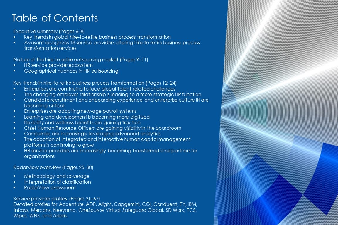 This RadarView includes a detailed analysis of the following hire-to-retire service providers: Accenture, ADP, Alight, Capgemini, CGI, Conduent, EY, IBM, Infosys, Mercans, Neeyamo, OneSource Virtual, Safeguard Global, SD Worx, TCS, Wipro, WNS, and Zalaris.