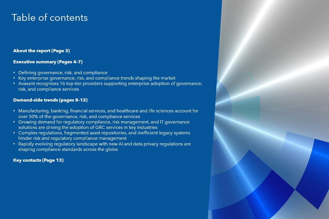 This report identifies key demand-side trends in the governance, risk, and compliance (GRC) services space, guiding enterprises in refining their GRC strategies. It offers insights into the evolving regulatory landscape, industry-driven adoption of GRC solutions, key challenges faced by enterprises, and the integration of Gen AI into GRC processes based on Avasant’s assessment.