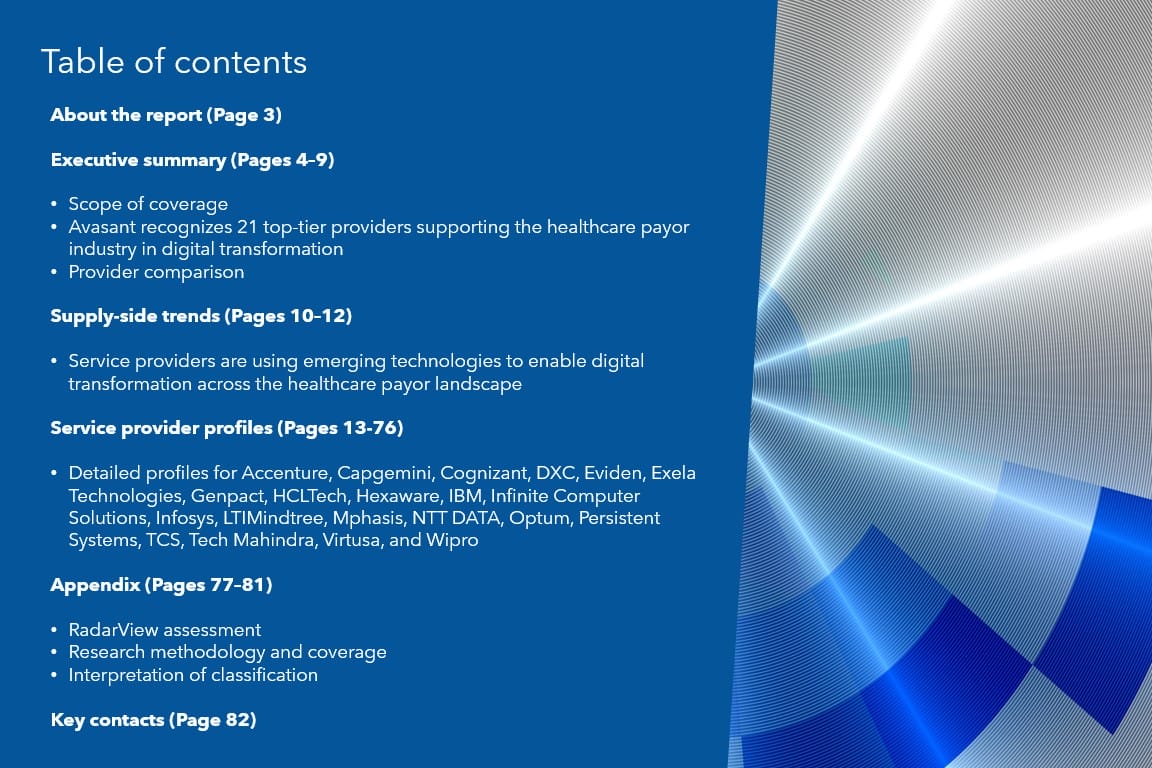 This RadarView includes a detailed analysis of the following service providers: Accenture, Capgemini, Cognizant, DXC, Eviden, Exela Technologies, Genpact, HCLTech, Hexaware, IBM, Infinite Computer Solutions, Infosys, LTIMindtree, Mphasis, NTT DATA, Optum, Persistent Systems, TCS, Tech Mahindra, Virtusa, and Wipro.
