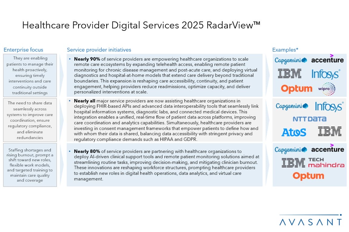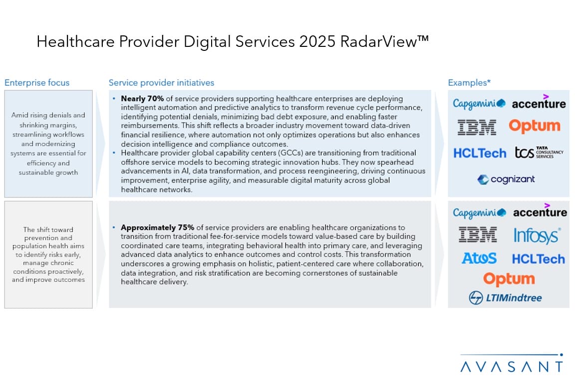 The Healthcare Provider Digital Services 2025 RadarView™ highlights key supply-side trends in the healthcare provider space and Avasant’s viewpoint on them. It aids companies in identifying top service providers to assist in the digital transformation of their offerings for this sector. It also analyzes each service provider’s capabilities in technology and delivery support, enabling organizations to identify the right strategic partners.