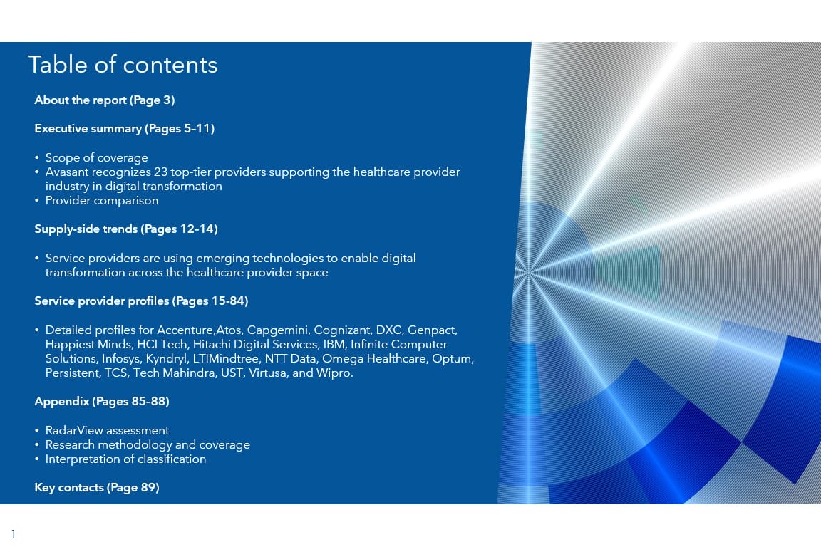 This RadarView™ aims to help healthcare providers craft a robust strategy based on industry outlook, best practices, and digital transformation. It begins with a summary of key trends shaping the supply side of the market. It continues with a detailed assessment of 23 providers offering digital services to healthcare providers. Each profile provides an overview of the service provider, its industry-specific solutions, a list of representative clients and partnerships, and brief client case studies. Each profile concludes with analyst insights on the provider’s practice maturity, investments and innovation, and partner ecosystem.