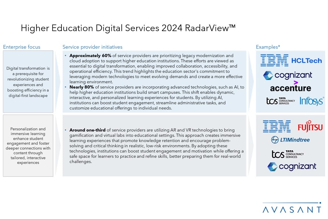 The Higher Education Digital Services 2024 RadarView™ highlights key supply-side trends in the higher education space and Avasant’s viewpoint on them. It aids higher education institutes in identifying top service providers to assist them in the digital transformation of their services. It also analyzes each service provider’s capabilities in technology and delivery support, enabling organizations to select the right strategic partners for higher education digital services.