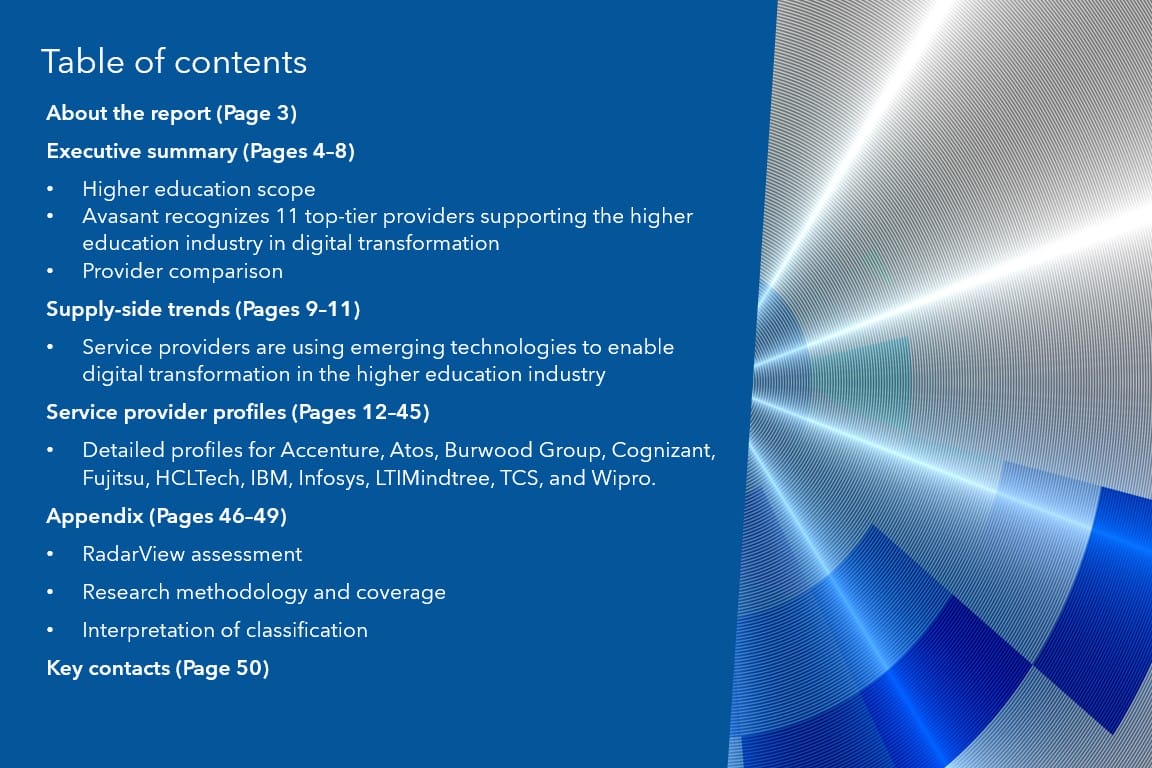 This RadarView™ helps higher education institutes craft a robust business strategy based on industry outlook, best practices, and digital transformation. It begins with a summary of key trends shaping the supply side of the market. It continues with a detailed assessment of 11 providers offering digital services for higher education institutions. Each profile gives an overview of the service provider, its industry-specific solutions, and a list of representative clients and partnerships, along with brief client case studies. Each profile concludes with analyst insights on the provider’s practice maturity, investments and innovation, and partner ecosystem.