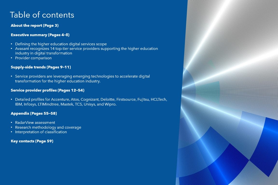 This RadarView™ assists higher education enterprises in developing a robust strategy by providing insights into industry trends, best practices, and digital transformation. It begins with an overview of the key trends shaping the market’s supply side and follows with an in-depth assessment of 14 providers offering digital services in higher education. Each provider profile includes an overview of its industry-specific solutions, a list of representative clients and partnerships, and brief client case studies. Each profile concludes with analyst insights on the provider’s practice maturity, investments, innovation, and partner ecosystem.