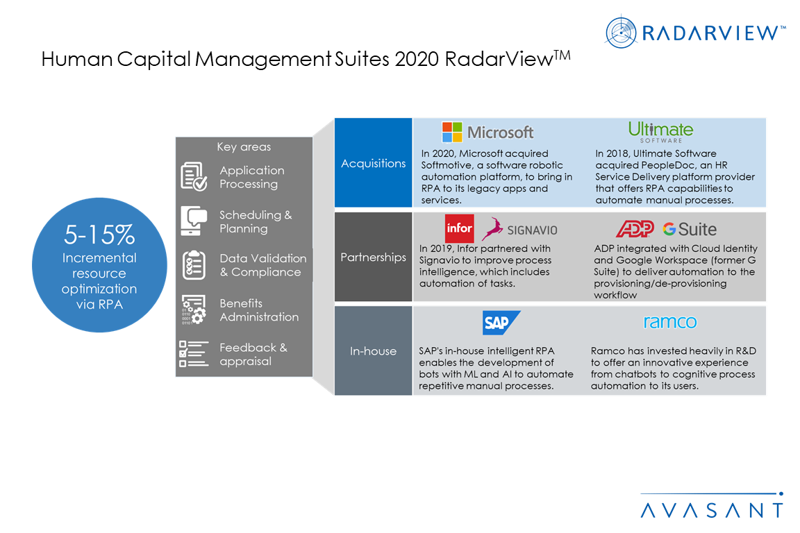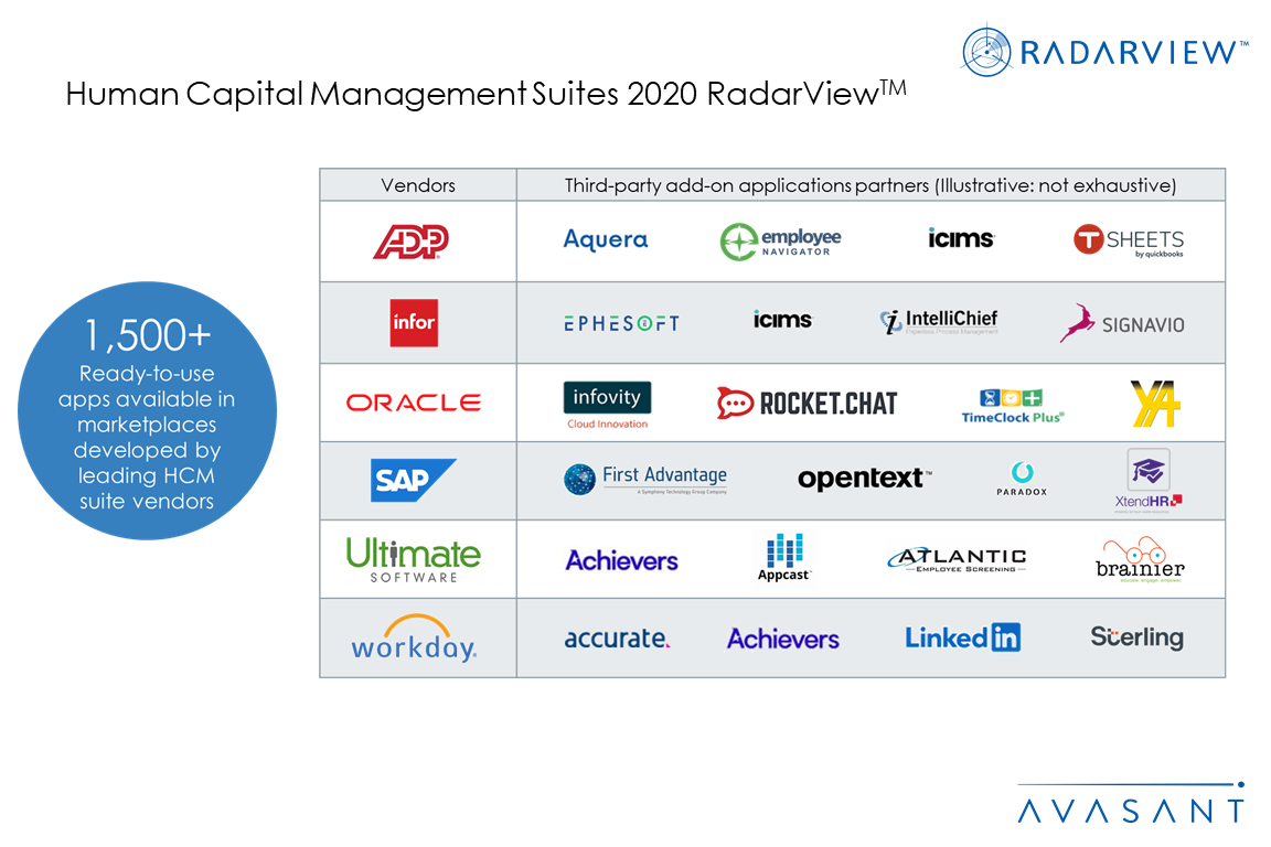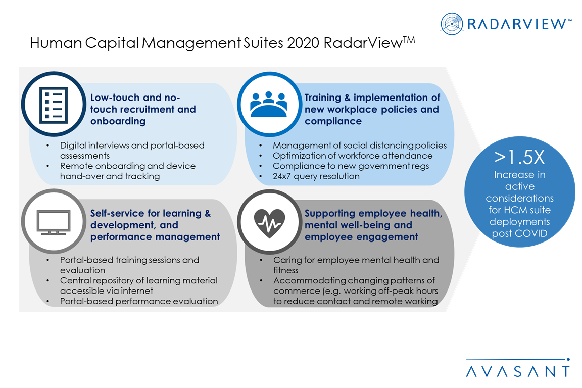 The Human Capital Management Suite 2020 RadarView report highlights the key adoption and product evolution trends in the HCM suites space and Avasant’s viewpoint on them. It addresses the need of enterprises to identify the right solution to enhance their HR function. It also brings out detailed capability and experience analyses of leading vendors to assist enterprises in identifying strategic partners for their HR transformation journeys.
