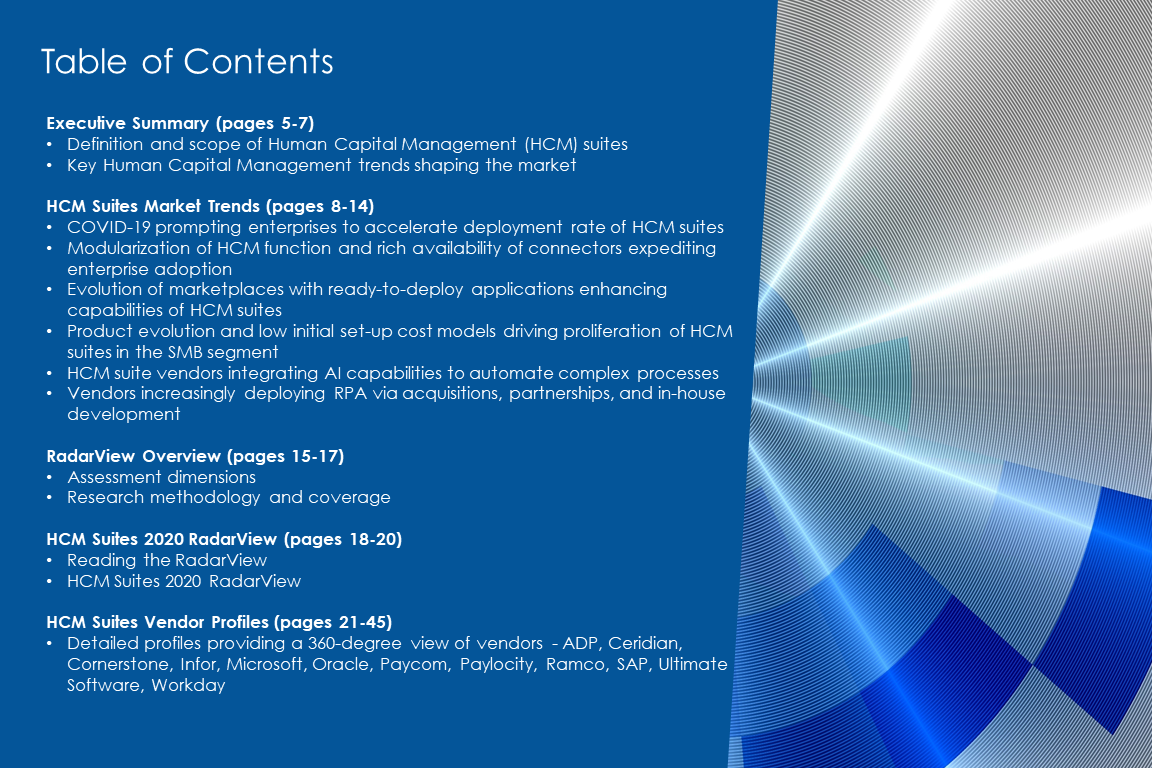It also provides fact-based detailed assessment of leading 12 Human Capital Management (HCM) suites vendors. The profiles for each of these 12 vendors capture their organization overview, HCM suite solutions and offerings, key clients, partnerships, case studies, and analyst insights on their product maturity, enterprise adaptability, and innovation roadmap, thus providing a 360-degree view of vendors.