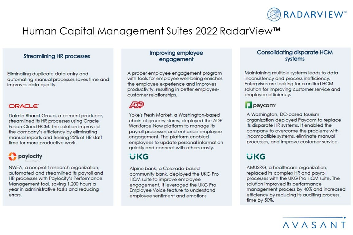 HCM suites help enterprises streamline HR processes, improve employee engagement, and provide a unified view of HR data in real-time. These solutions help enterprises automate HR processes and save time on administrative tasks with self-service capabilities. It also helps enterprises stay compliant with payroll and recruitment regulations. Thus, identifying the right HCM suite based on business requirements is crucial.
