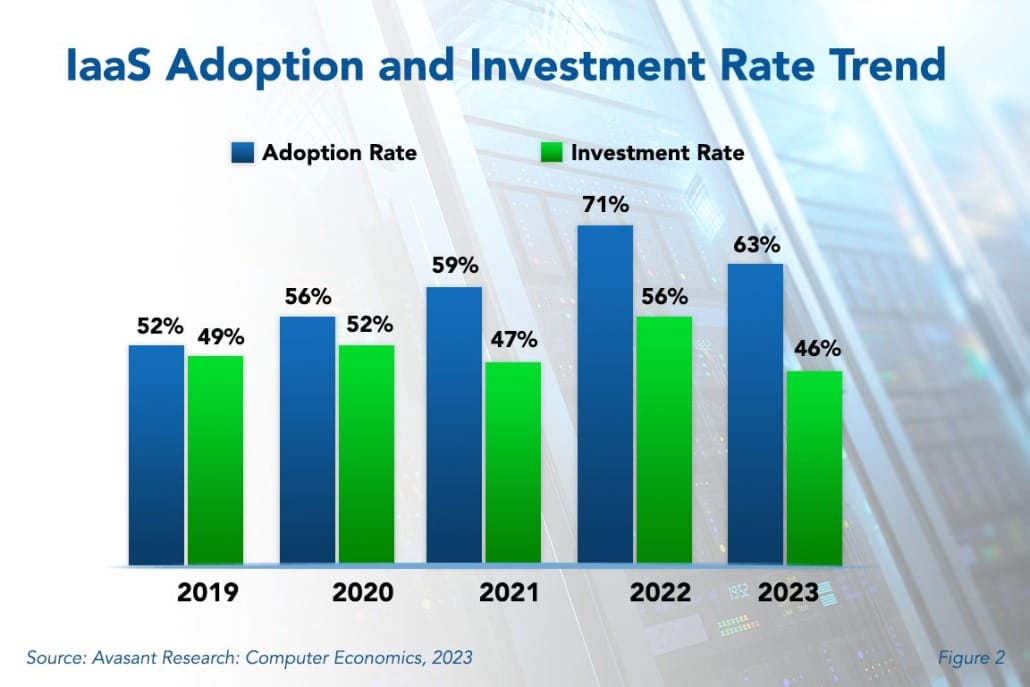 Figure 2 from our full report, IaaS Adoption Trends and Customer Experience, shows that adoption rates for IaaS have shown a generally increasing trend, while investment rates have fluctuated. In the past five years, adoption (the blue bars) has risen from 52% of all organizations in 2019 to 63% in 2023, after an anomalous spike to 71% in 2022. During the same period, the percentage of organizations making new investments in IaaS (the green bars) has fluctuated with year-to-year differences of up to 9%, finally standing at 46% in 2023.