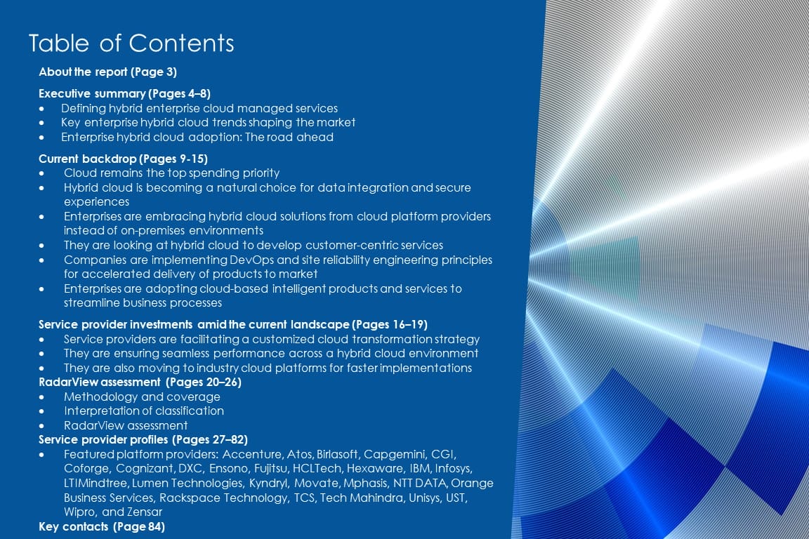 This RadarView includes an analysis of the following digital service providers in the hybrid cloud space: Accenture, Atos, Birlasoft, Capgemini, CGI, Coforge, Cognizant, DXC, Ensono, Fujitsu, HCLTech, Hexaware, IBM, Infosys, Kyndryl, LTIMindtree, Lumen Technologies, Movate, Mphasis, NTT DATA, Orange Business Services, Rackspace Technology, TCS, Tech Mahindra, Unisys, UST, Wipro, and Zensar.