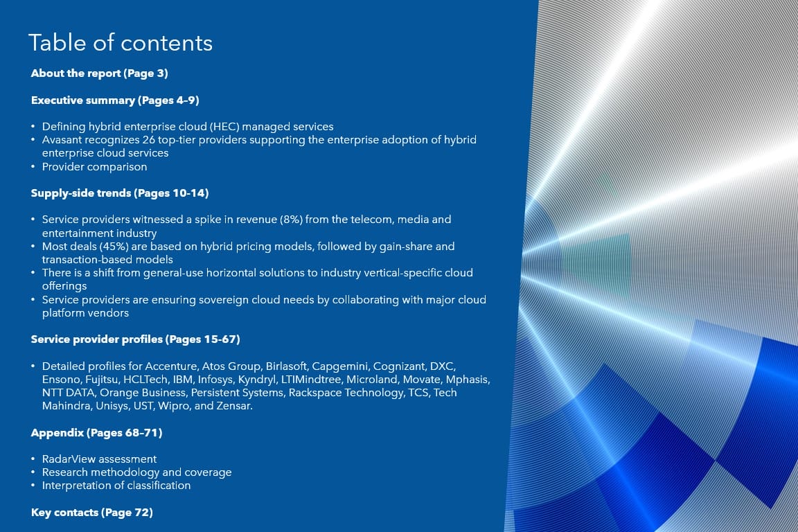 This RadarView includes a detailed analysis of the following hybrid enterprise cloud service providers: Accenture, Atos Group, Birlasoft, Capgemini, Cognizant, DXC, Ensono, Fujitsu, HCLTech, IBM, Infosys, Kyndryl, LTIMindtree, Microland, Movate, Mphasis, NTT DATA, Orange Business, Persistent Systems, Rackspace Technology, TCS, Tech Mahindra, Unisys, UST, Wipro, and Zensar.