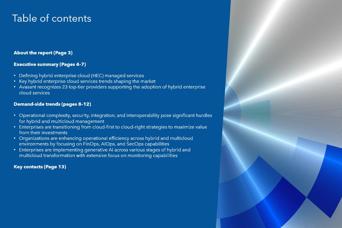 This report identifies key demand-side trends in the hybrid enterprise cloud services space, helping enterprises fine-tune their hybrid cloud management strategies. It provides an overview of top implementation challenges, the transition from cloud-first to cloud-right strategies, operational efficiency improvements, and the integration of generative AI (Gen AI) into hybrid and multicloud transformation based on Avasant’s assessment.