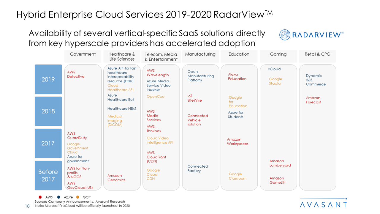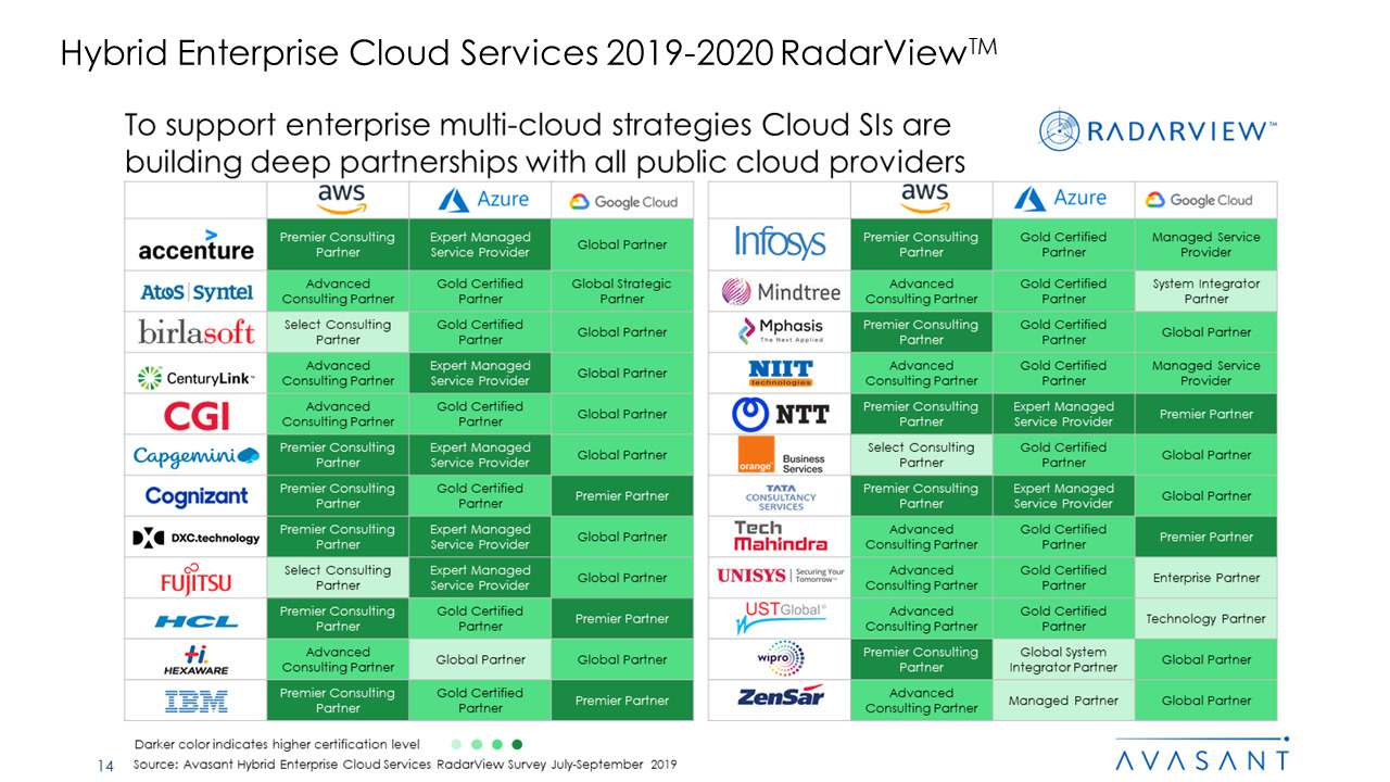 The Hybrid Enterprise Cloud Services RadarView 2019 Report addresses the need of the enterprises to understand the key trends in the hybrid enterprise cloud space and to identify cloud system integrators (Cloud SIs) that can help migrate monolithic applications to the cloud and then manage the resulting environment optimally. This 86 pages report also highlights the key trends in the market and Avasant’s view on the road ahead for enterprises leveraging hybrid enterprise cloud over the next 12 to 18 months.